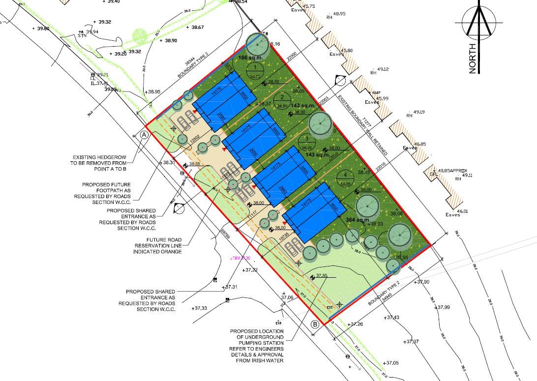 Shovel ready site with Full Planning Permission for Four No. Five bedroom split level detached homes. A grant of full planning permission received on the 22-8-19 for this development of four detached homes of c.248 sq.m / c.2,669 sq.ft. The site extends to c. 2,622 sq.m / 0.65 Acres with access provided to mains services. Each home extends to c. 248 sq.m / c. 2,669 sq.ft. and comprises of entrance hall, sitting room, open plan kitchen /dining and living room, utility room, WC, four bedrooms and two bathrooms at first floor level, with fifth bedroom, play room, bathroom and store room at second floor level.. Plans and details available upon request from DNG Reid & Coppinger Auctioneers. LOCATION The site is located just off the prestigious Williamstown Road at Bishopscourt, c. 4km from Waterford City and c.1.5km from Tesco Ardkeen and University Hospital Waterford Further information and viewing details from DNG Reid & Coppinger Auctioneers 051 842233