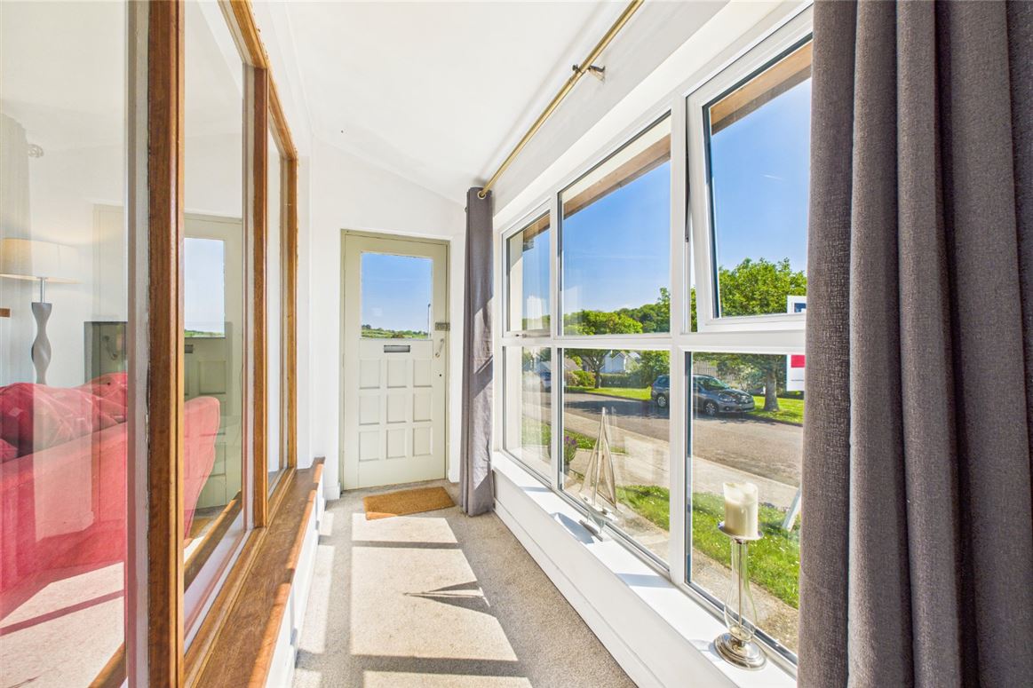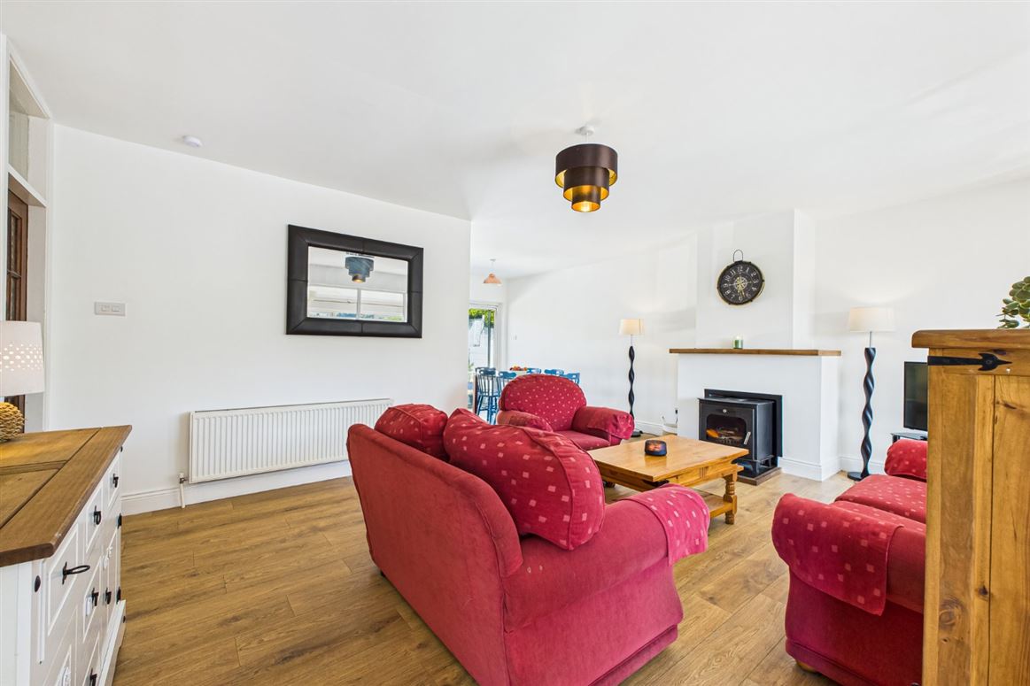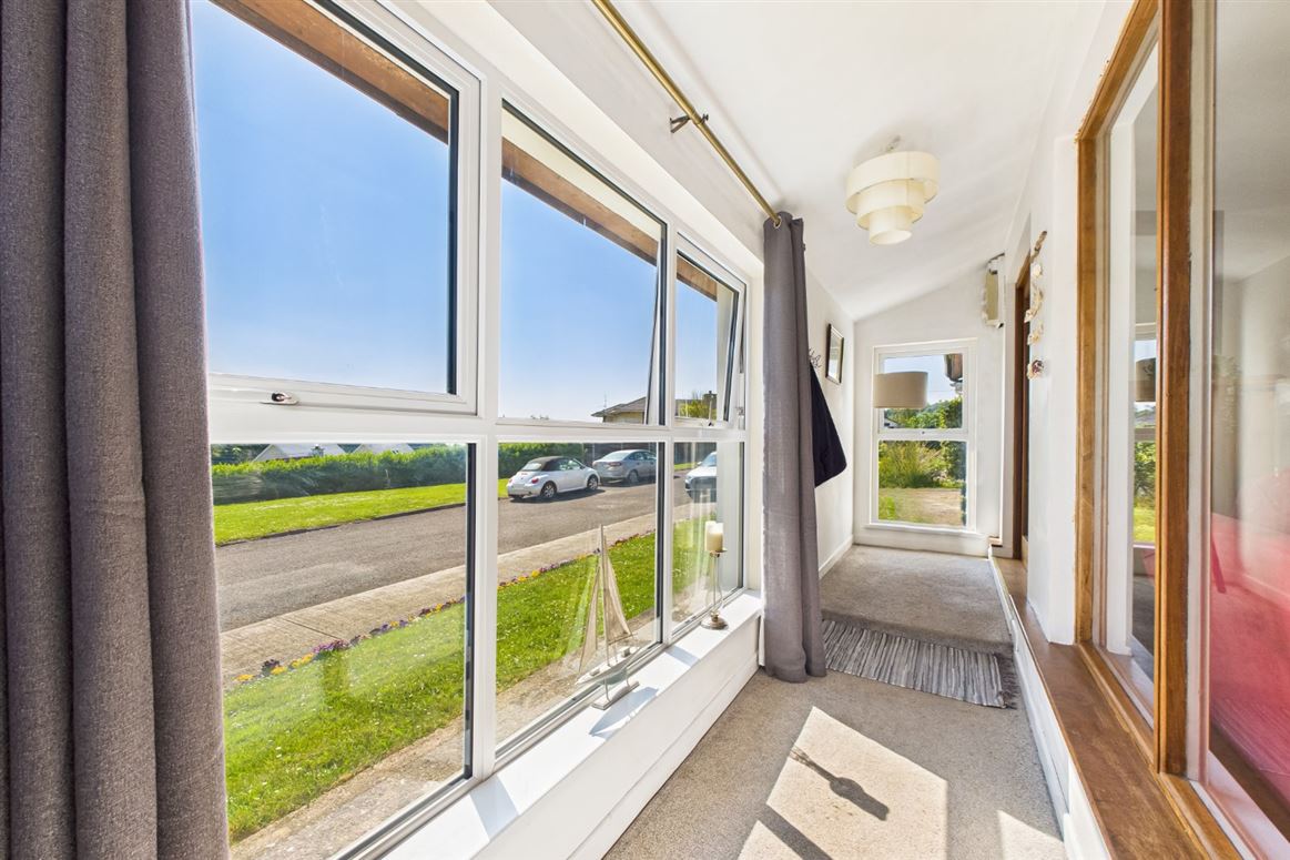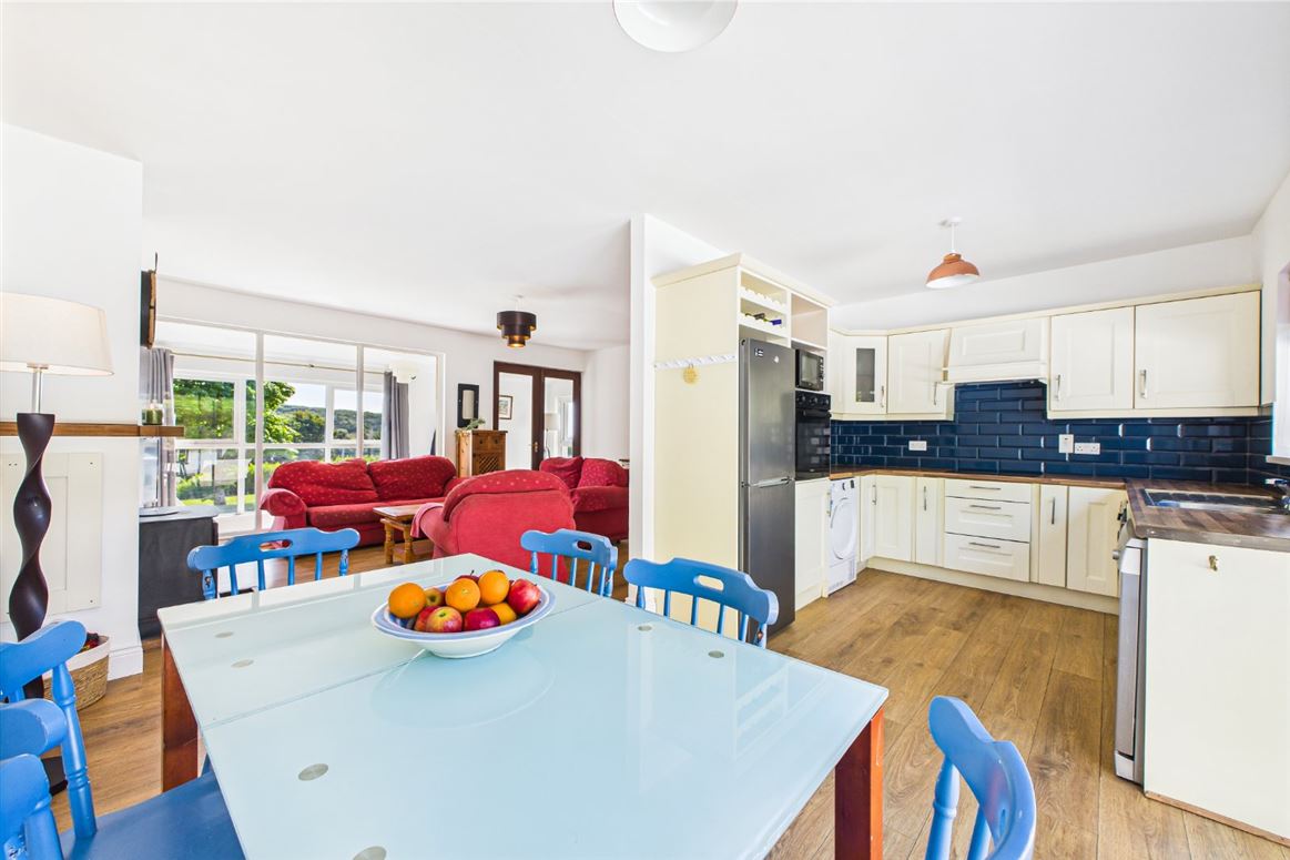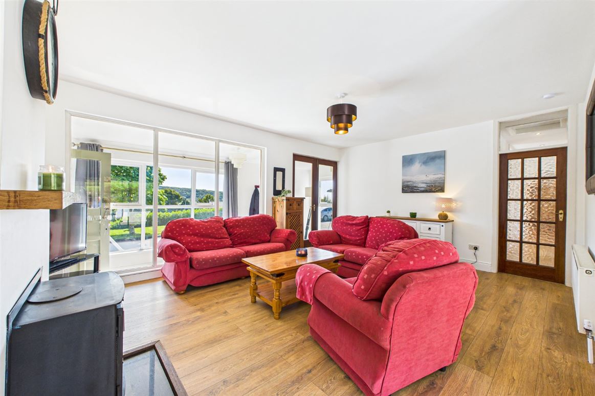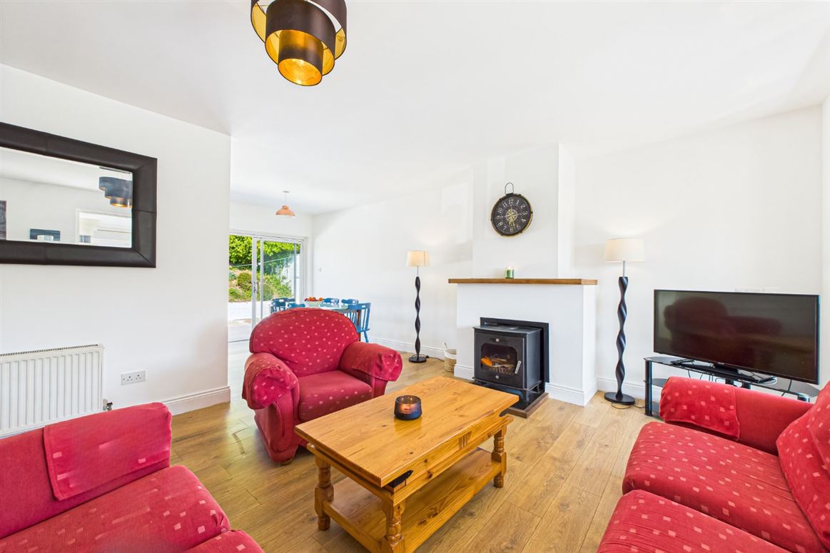 Laminate wood flooring. Glazed wall looking forward toward the green and view of village and sea. Solid fuel stove to chimney.