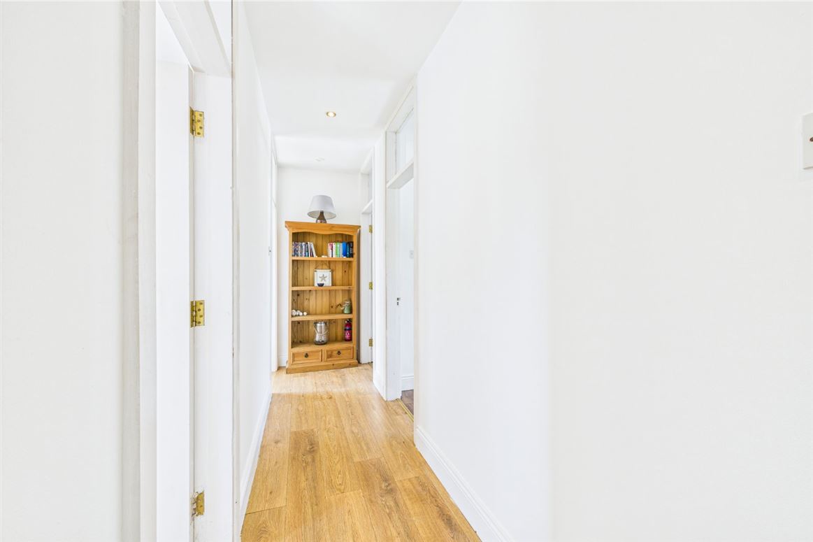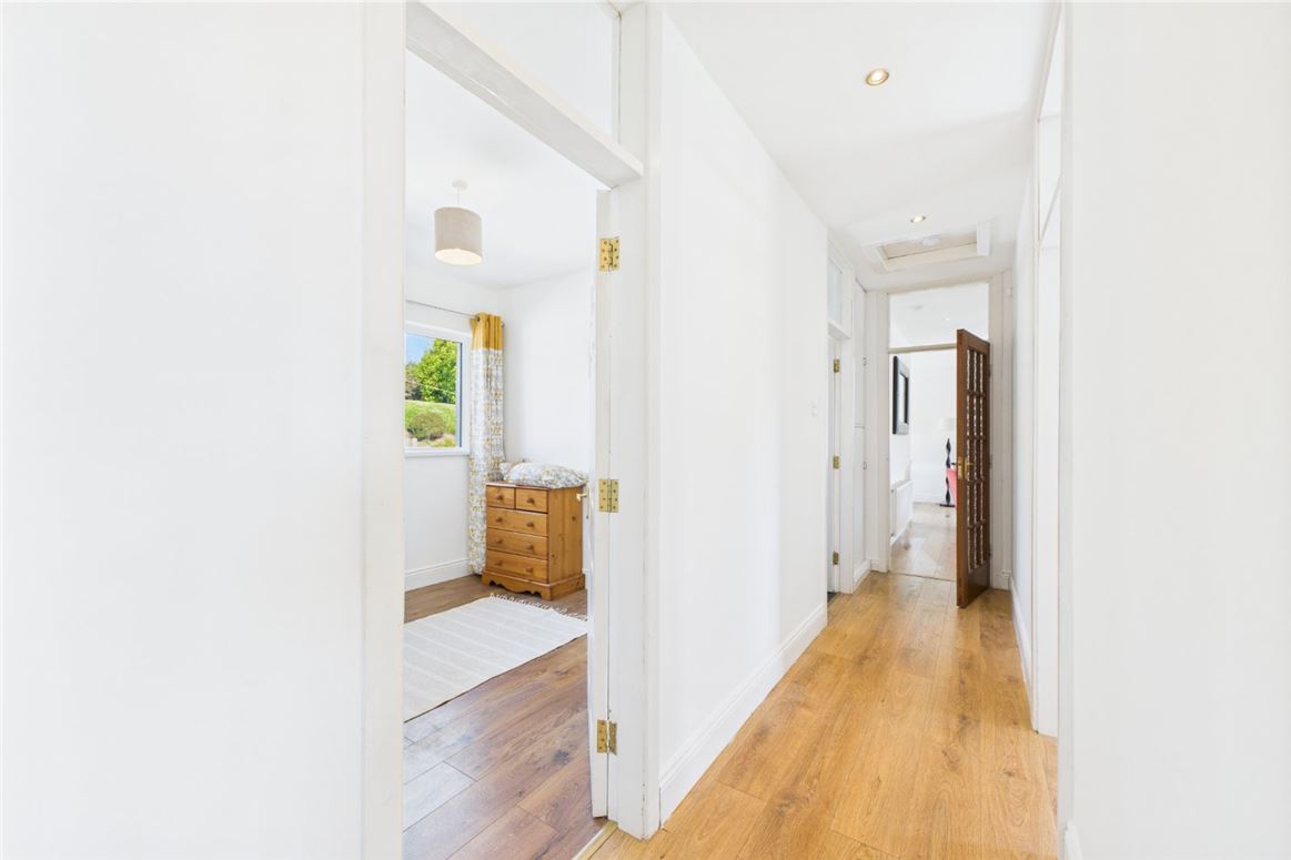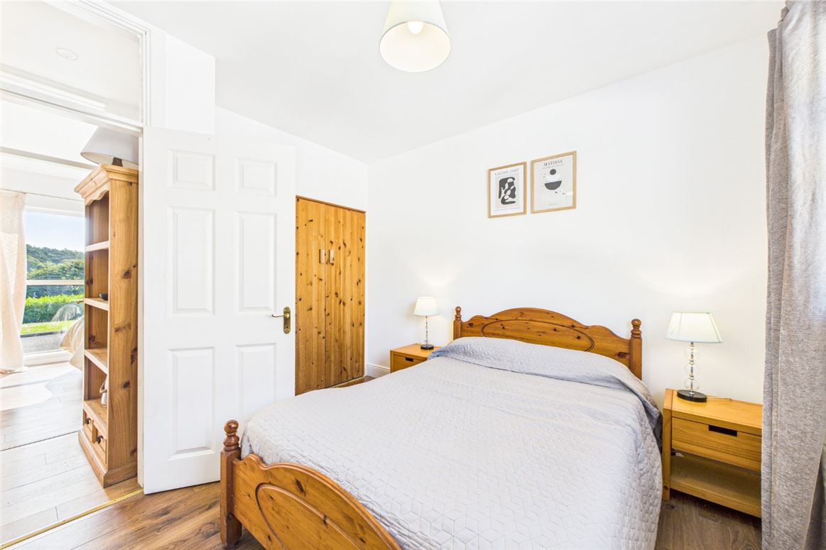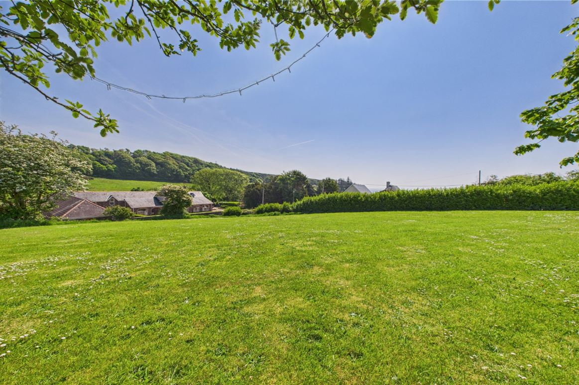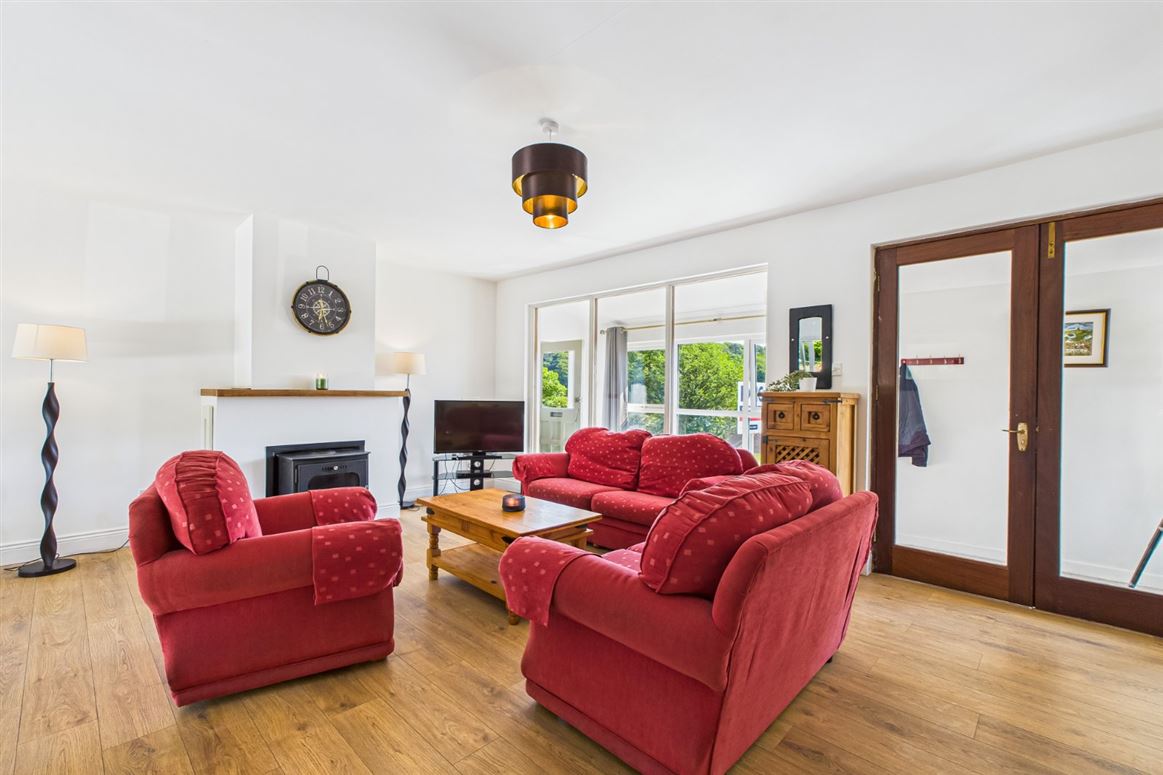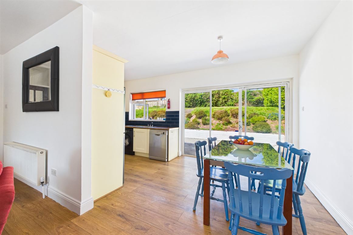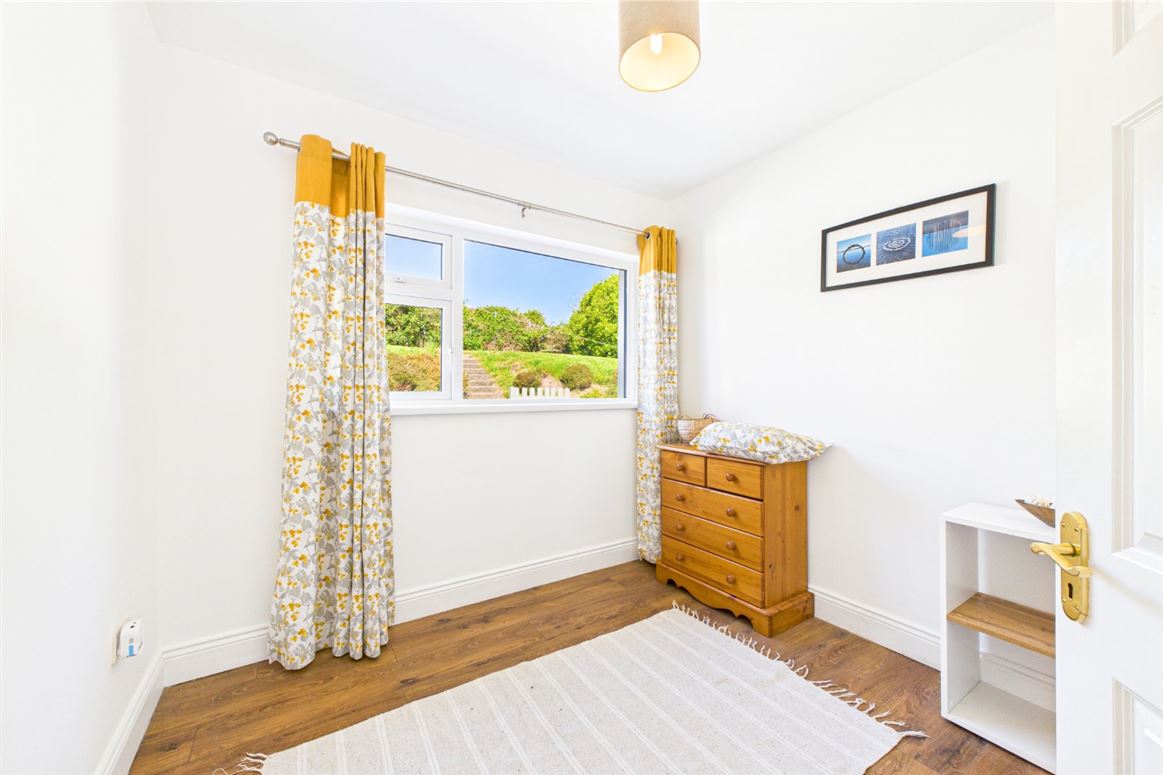 Laminate wood flooring. Glazed wall looking forward toward the green and view of village and sea. Solid fuel stove to chimney.