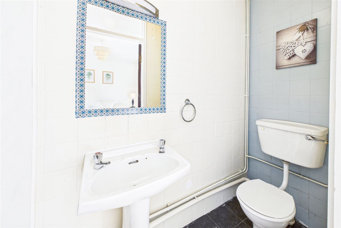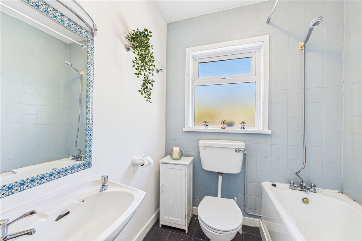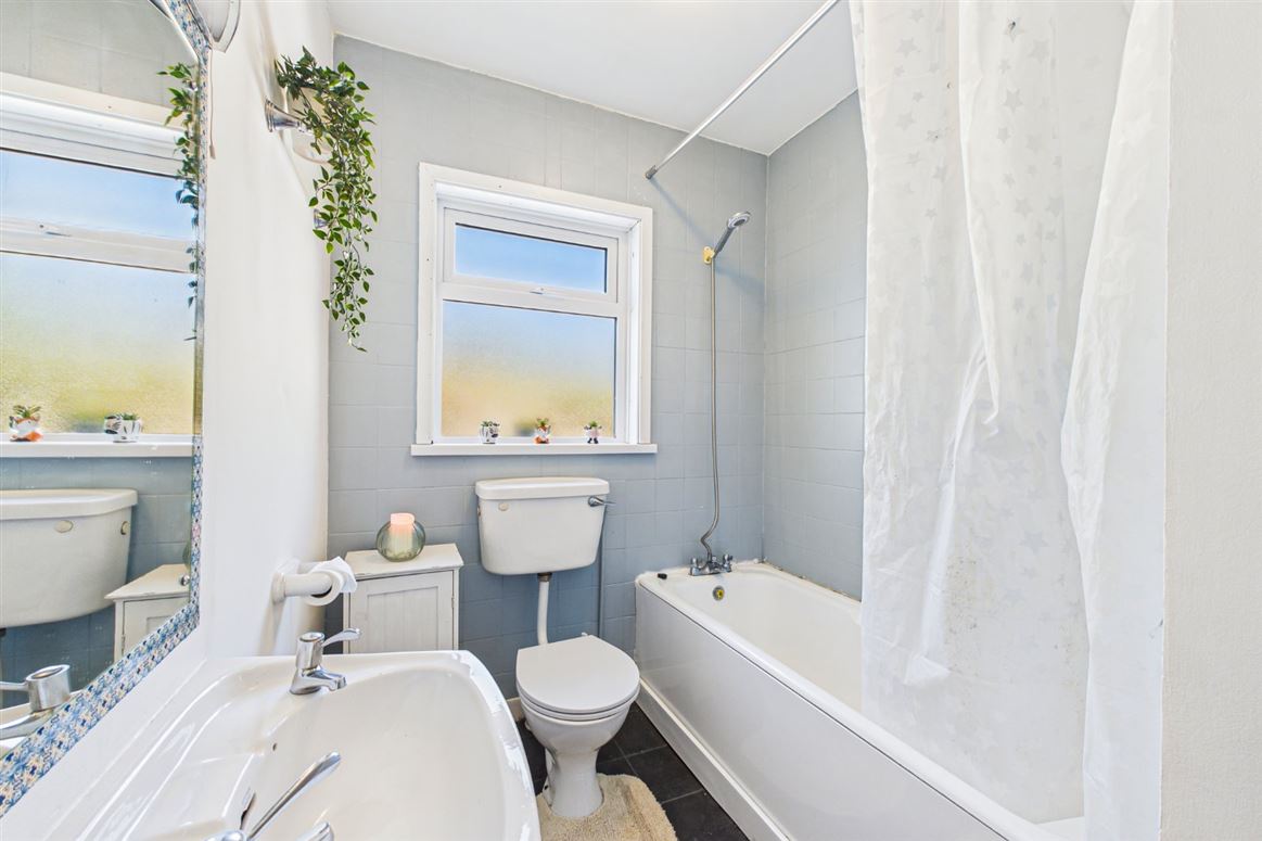 Tiled flooring. WC. WHB. Bath. Walls tiled from floor to ceiling. Chrome heated towel rail