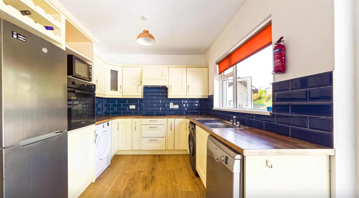 Laminate wood flooring throughout. Cream shaker style fitted kitchen. Tiled splashback. Ceramic hob fitted oven. Sliding patio door to rear yard and garden.