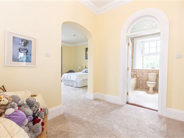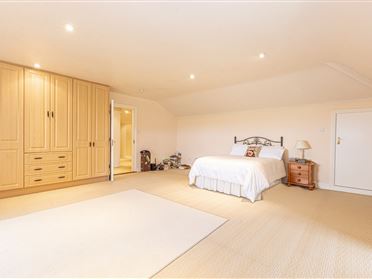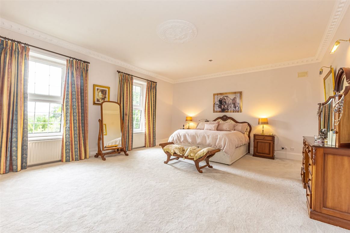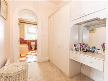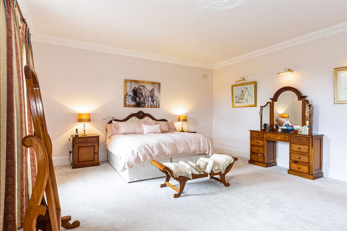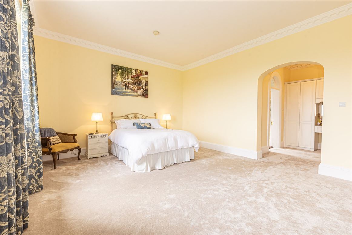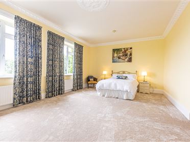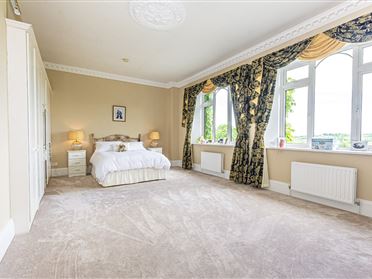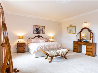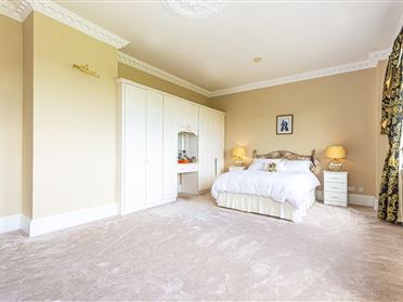 Considerably sized master bedroom suite with separate entrance hallway, and separate entrance doorway. Extensive fitted wardrobes and vanity / dressing area. Carpet flooring throughout. Coving to ceiling with centre rose. Curtains to windows.