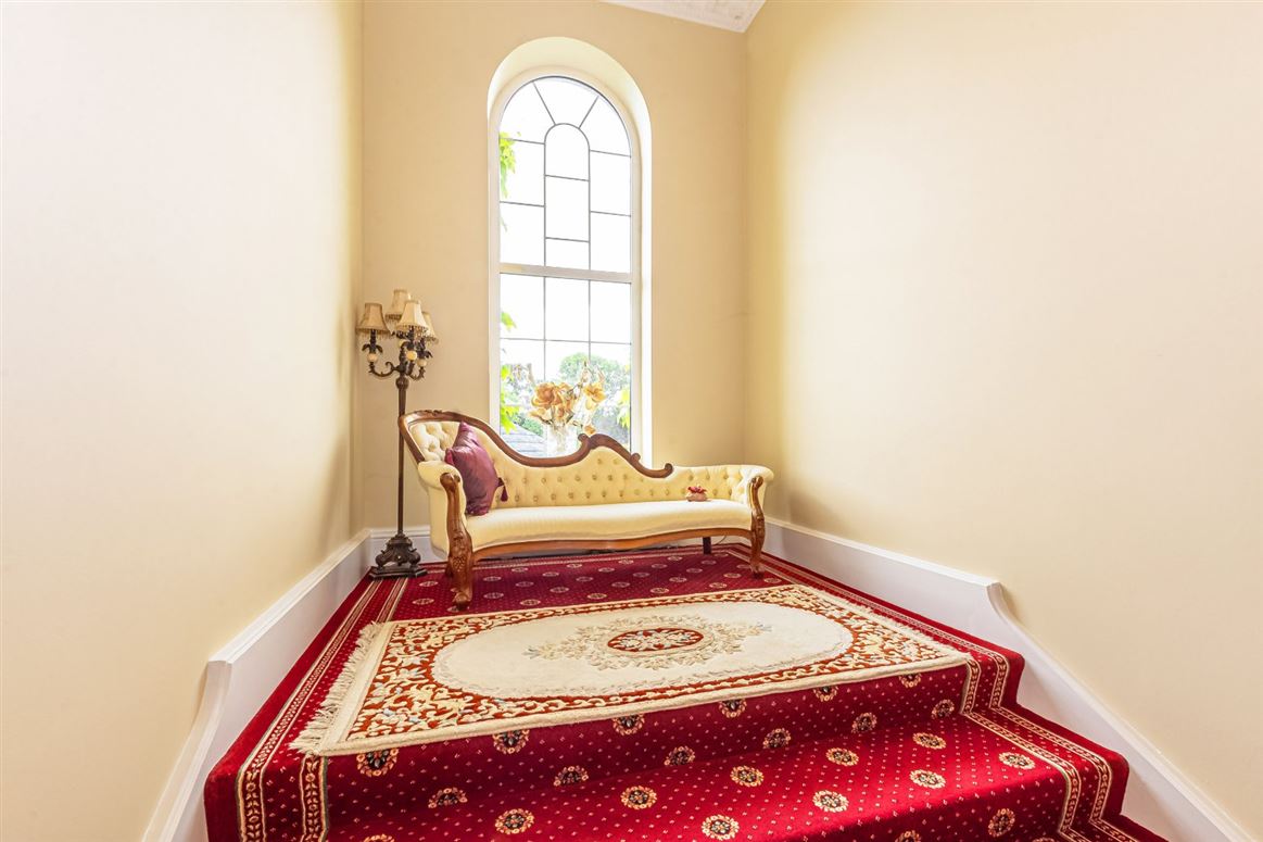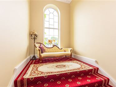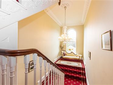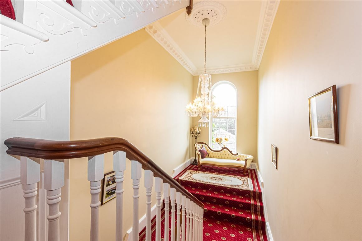 Traditional wooden staircase, hand made locally with off-standard spindles and newel posts. Painted in a white finish with mahogany handrail, with monkey's tail ending. Both the stairs and landing are finished in a tailor-made carpet with border detail throughout. Feature half-landing window and seating area. Decorative plaster coving and centre ceiling roses to ceiling.