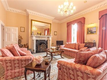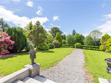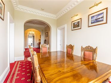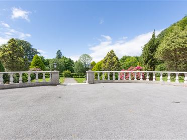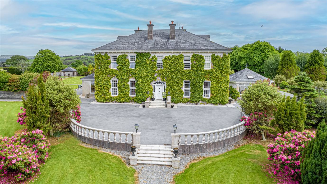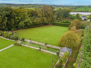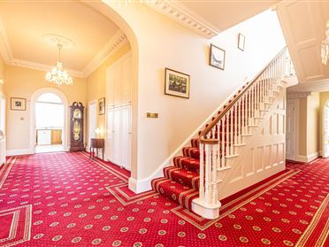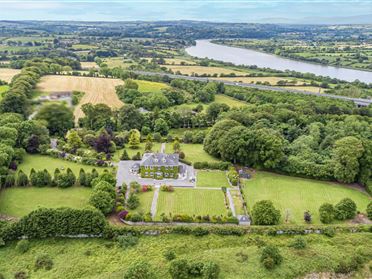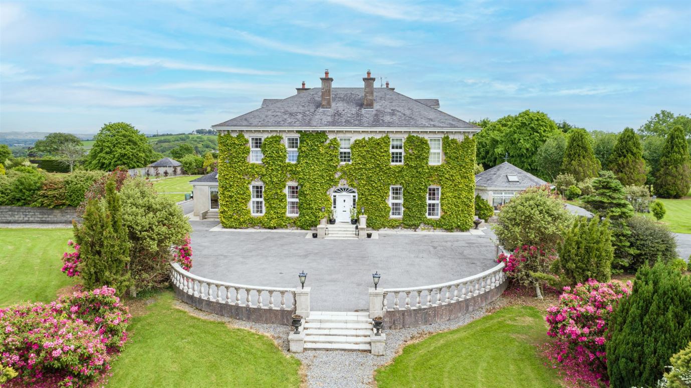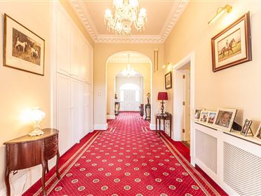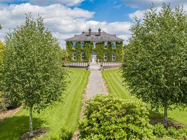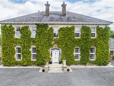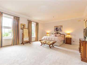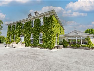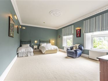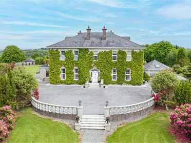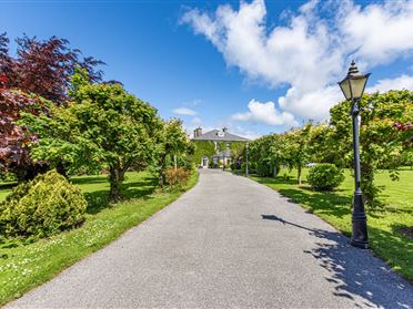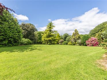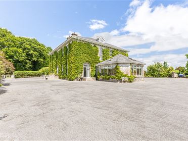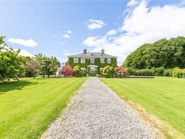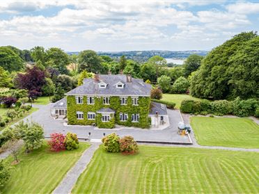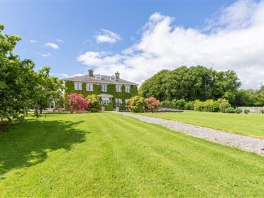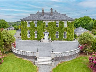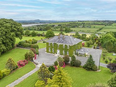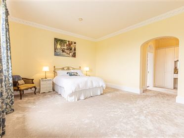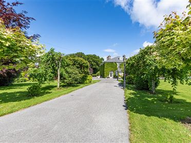 Carrigaleigh House is a splendid Georgian period styled residence, nestled in its own extensive mature woodland grounds and gardens of c. 4.65 acres. This opulent property extends to c. 671 Sqm / c. 7,223 sq.ft. having been constructed in the year 2000. Carrigaleigh House was commissioned with the brief to emulate the look and feel of a traditional Georgian period residence, with exceptional attention to detail having been paid to the design and finishes, even down to the layout of the extensive gardens. Today the property possesses all the luxuries and features one would expect from a property of its stature, but with all the benefits of modern construction methods and an excellent BER rating of B3. The property possesses all the luxuries and features one would expect from a property of its stature. Approached by a traditional entrance surrounded by mature woodland, the property becomes visible from the sweeping tarmacadam driveway through the extensive lawned gardens and mature shrubbery. The gardens surrounding the property have an abundance of trees and hedging with colourful shrubs and plants everywhere. The front door is approached by granite steps the lead to a large wood panelled front door with traditional fan light overhead, setting the tone of the grandeur and attention to the traditional detailing of the property. Upon entering the property, the scale of the home becomes evident when you are greeted by the expansive hallway and 12ft high ceilings, with ornate coving and Waterford Crystal chandeliers framed by decorative ceiling roses. Two formal reception rooms are accompanied by two further sun rooms at the North West side and the South East sides of the house, together with a large drawing room and separate dining room, giving a selection of reception rooms for any occasion. Both formal reception rooms feature solid marble fireplaces with Waterford Crystal chandeliers and matching wall lights, with decorative plaster coving and ceiling roses. The kitchen is to the rear corner of the property with separate utility and laundry rooms and a boot room to the rear. The kitchen is a traditional hand made solid oak painted kitchen with Stanley stove framed by a head height over mantle. The kitchen features a highly detailed solid oak panelled ceiling, mirrored below by a wide plank solid oak floor. The downstairs area also includes a guest shower room, storeroom and linen room. The upstairs is approached by a grand staircase, handmade locally and in a white painted finish, mahogany handrail and with a monkeys tail detail at the end. The stairs is carpeted matching the hallways in a rich red tailor made carpet with border detailing throughout. The upstairs landing leads to four sizable first floor bedrooms all of which have individual entrance hallways, dressing rooms and large en-suite bathrooms including the master bedroom. The second floor has a further two large double bedrooms with fitted wardrobes, and ample storage space with eaves access from both bedrooms.