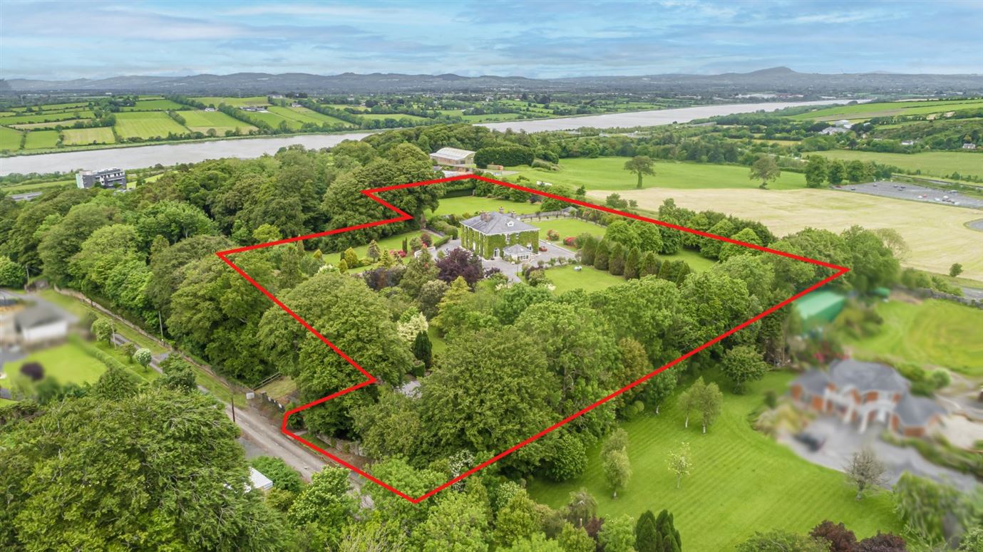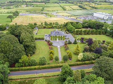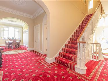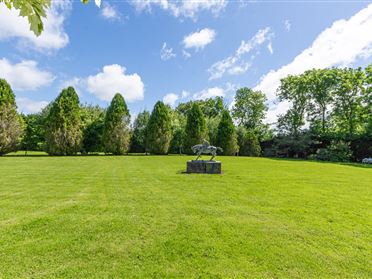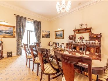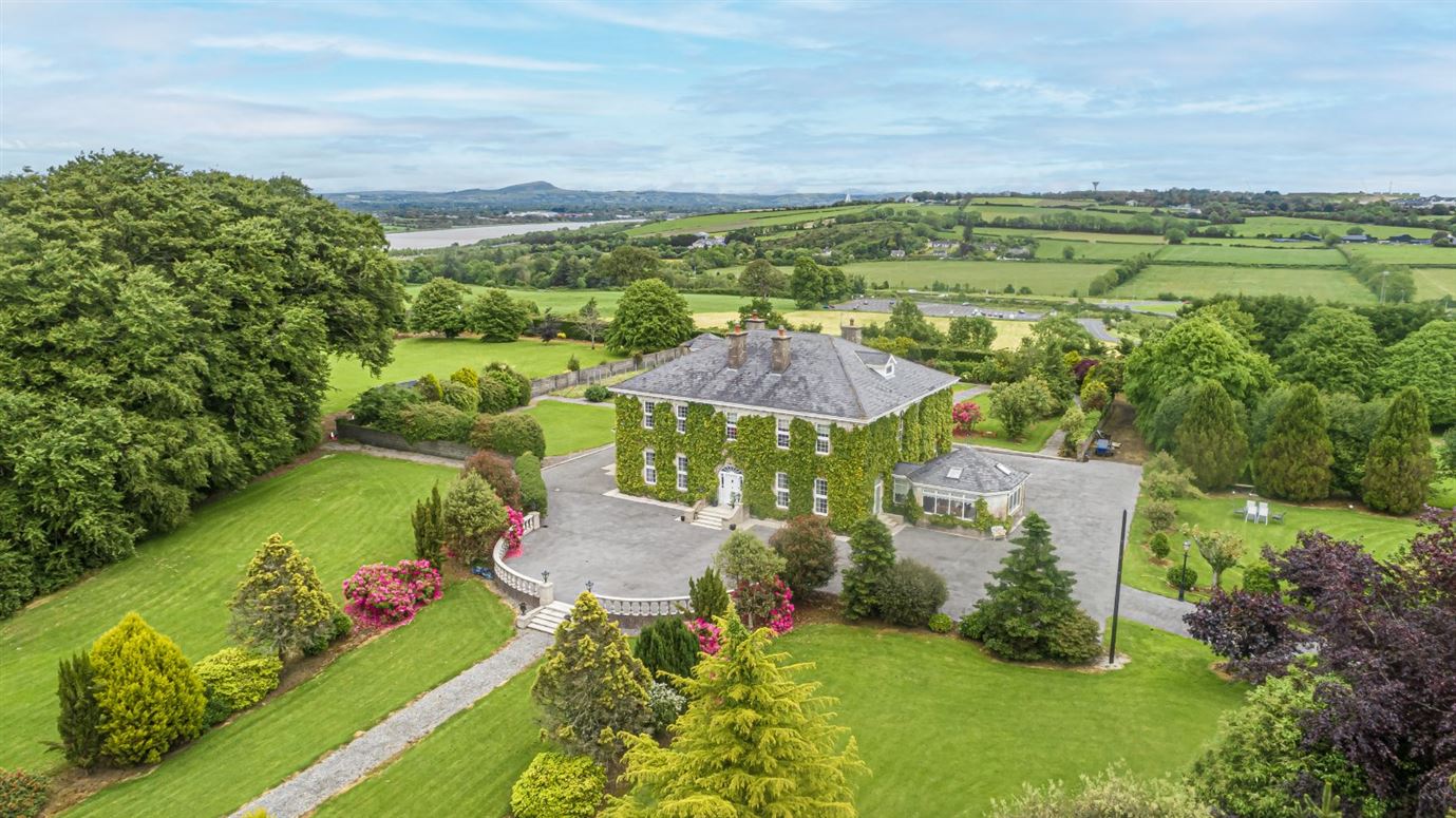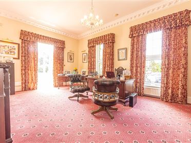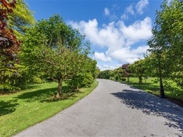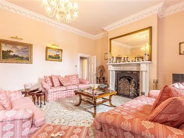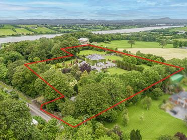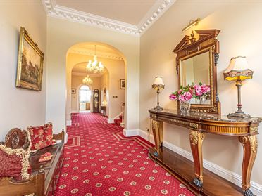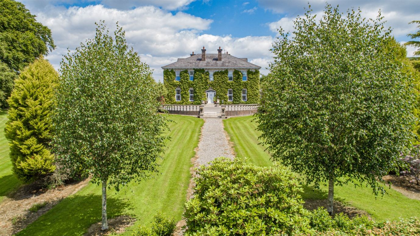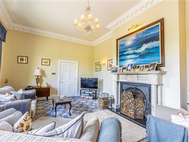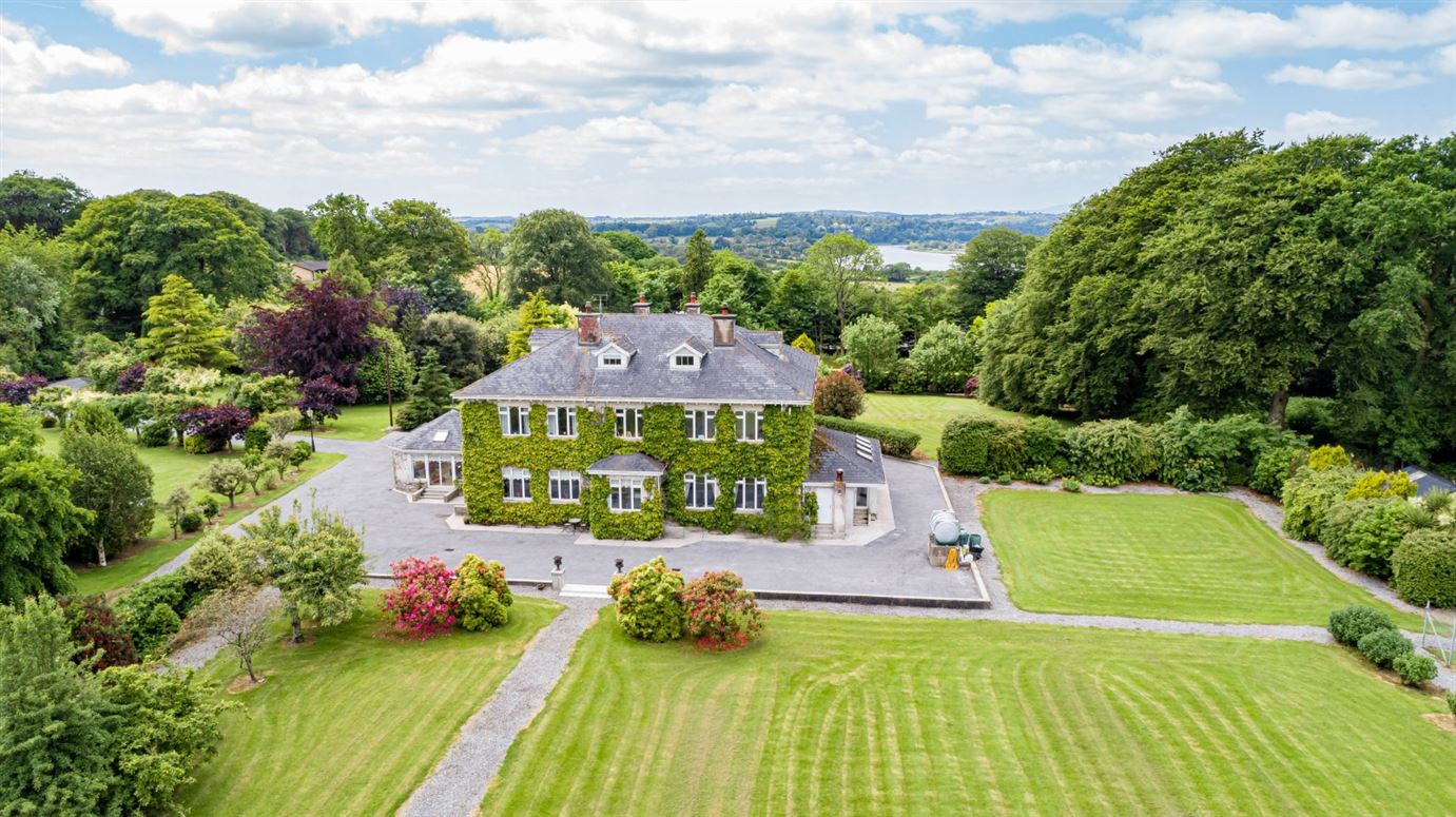 Carrigaleigh House is a splendid Georgian period styled residence, nestled in its own extensive mature woodland grounds and gardens of c. 4.65 acres. This opulent property extends to c. 671 Sqm / c. 7,223 sq.ft. having been constructed in the year 2000. Carrigaleigh House was commissioned with the brief to emulate the look and feel of a traditional Georgian period residence, with exceptional attention to detail having been paid to the design and finishes, even down to the layout of the extensive gardens. Today the property possesses all the luxuries and features one would expect from a property of its stature, but with all the benefits of modern construction methods and an excellent BER rating of B3. The property possesses all the luxuries and features one would expect from a property of its stature. Approached by a traditional entrance surrounded by mature woodland, the property becomes visible from the sweeping tarmacadam driveway through the extensive lawned gardens and mature shrubbery. The gardens surrounding the property have an abundance of trees and hedging with colourful shrubs and plants everywhere. The front door is approached by granite steps the lead to a large wood panelled front door with traditional fan light overhead, setting the tone of the grandeur and attention to the traditional detailing of the property. Upon entering the property, the scale of the home becomes evident when you are greeted by the expansive hallway and 12ft high ceilings, with ornate coving and Waterford Crystal chandeliers framed by decorative ceiling roses. Two formal reception rooms are accompanied by two further sun rooms at the North West side and the South East sides of the house, together with a large drawing room and separate dining room, giving a selection of reception rooms for any occasion. Both formal reception rooms feature solid marble fireplaces with Waterford Crystal chandeliers and matching wall lights, with decorative plaster coving and ceiling roses. The kitchen is to the rear corner of the property with separate utility and laundry rooms and a boot room to the rear. The kitchen is a traditional hand made solid oak painted kitchen with Stanley stove framed by a head height over mantle. The kitchen features a highly detailed solid oak panelled ceiling, mirrored below by a wide plank solid oak floor. The downstairs area also includes a guest shower room, storeroom and linen room. The upstairs is approached by a grand staircase, handmade locally and in a white painted finish, mahogany handrail and with a monkeys tail detail at the end. The stairs is carpeted matching the hallways in a rich red tailor made carpet with border detailing throughout. The upstairs landing leads to four sizable first floor bedrooms all of which have individual entrance hallways, dressing rooms and large en-suite bathrooms including the master bedroom. The second floor has a further two large double bedrooms with fitted wardrobes, and ample storage space with eaves access from both bedrooms.