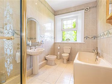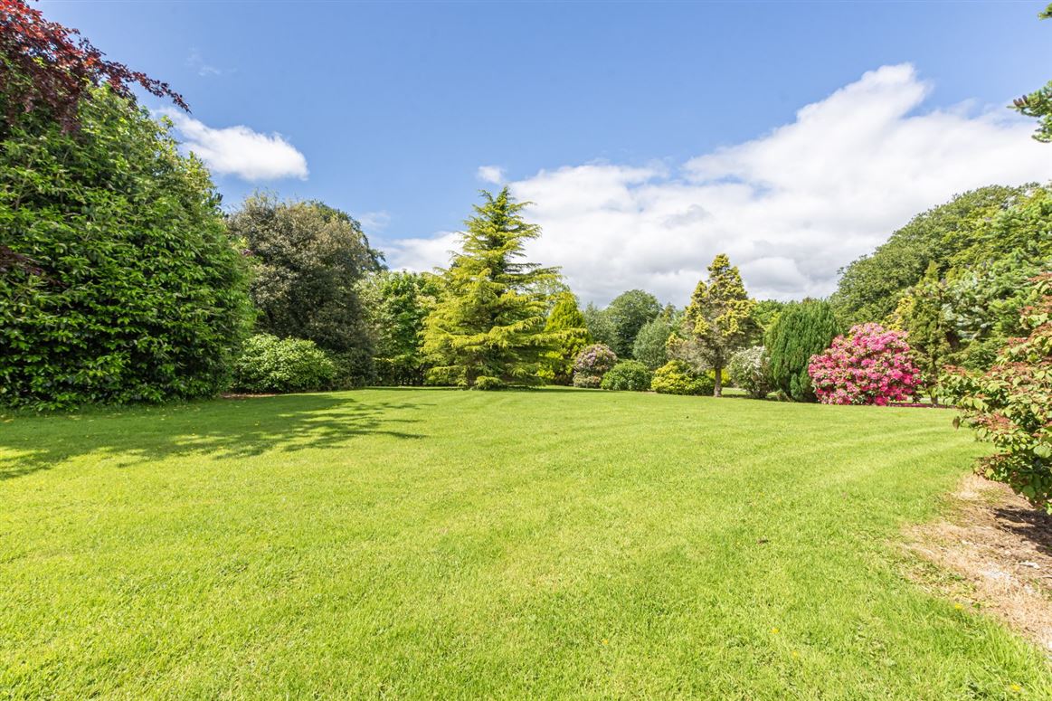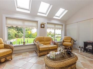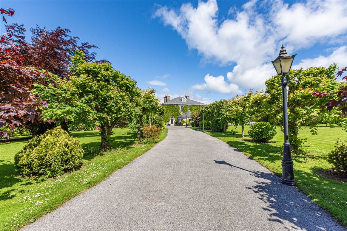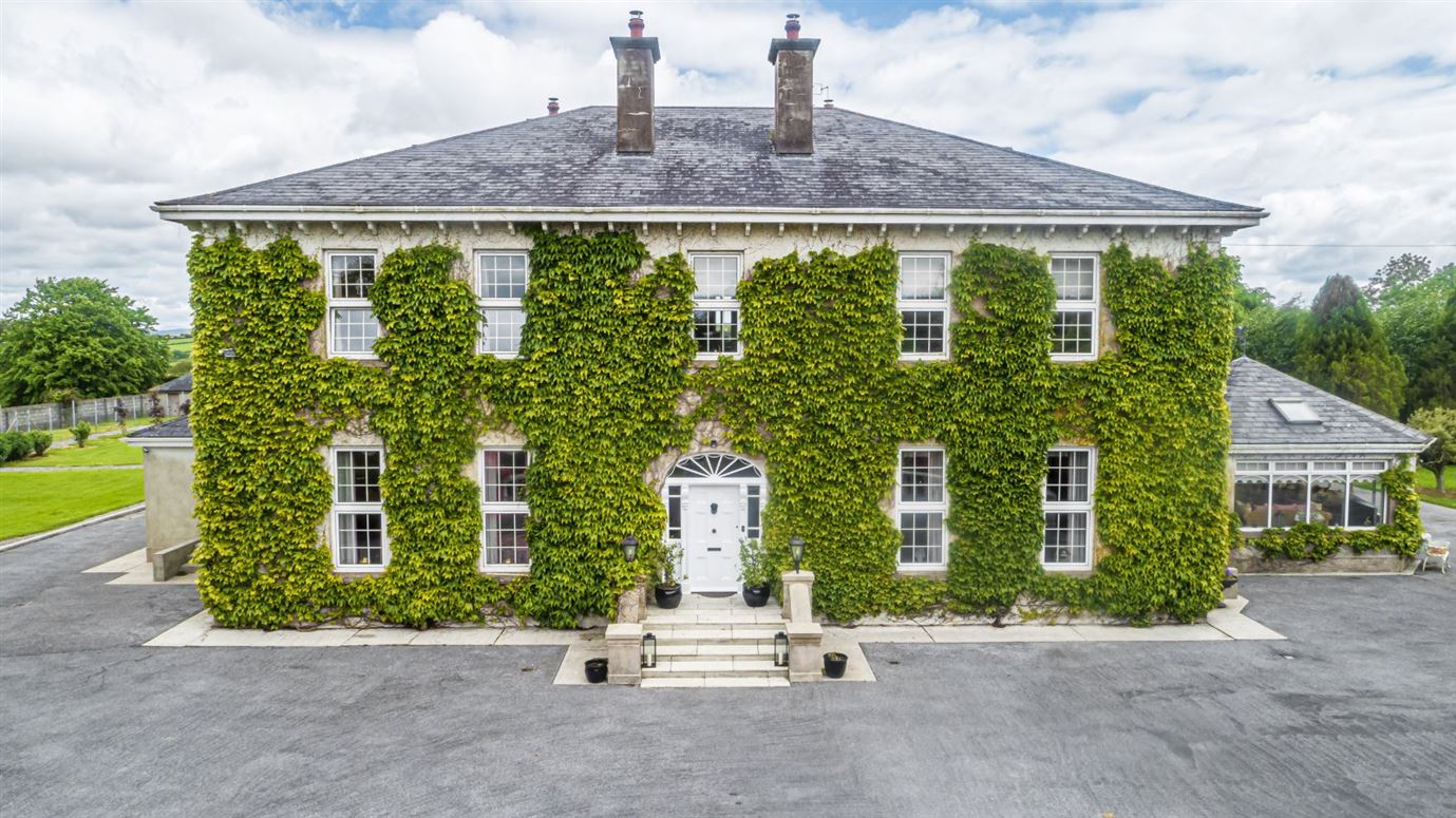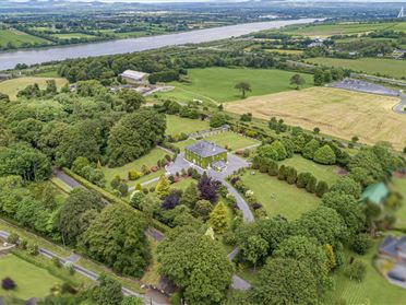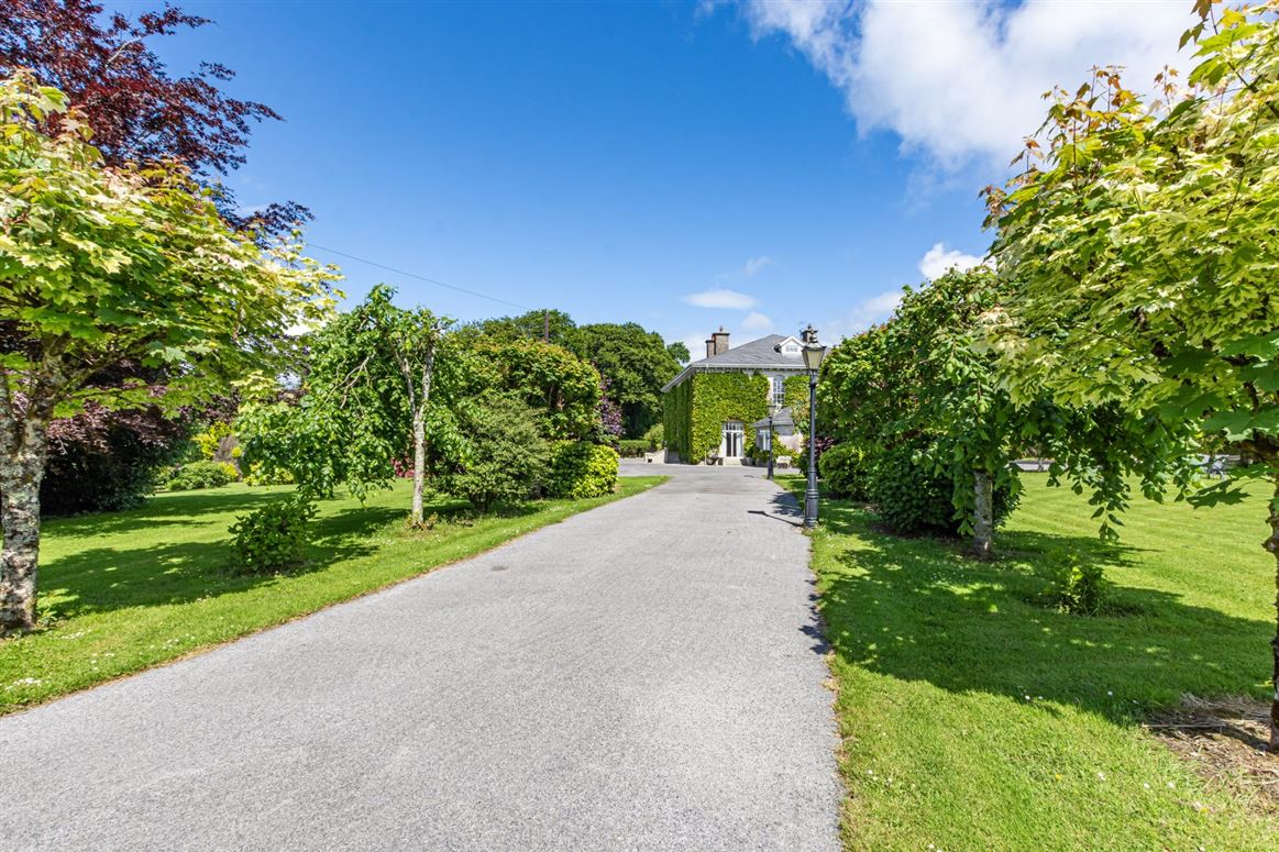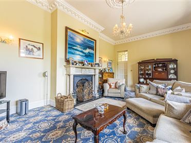 Carrigaleigh House is a splendid Georgian period styled residence, nestled in its own extensive mature woodland grounds and gardens of c. 4.65 acres. This opulent property extends to c. 671 Sqm / c. 7,223 sq.ft. having been constructed in the year 2000. Carrigaleigh House was commissioned with the brief to emulate the look and feel of a traditional Georgian period residence, with exceptional attention to detail having been paid to the design and finishes, even down to the layout of the extensive gardens. Today the property possesses all the luxuries and features one would expect from a property of its stature, but with all the benefits of modern construction methods and an excellent BER rating of B3. The property possesses all the luxuries and features one would expect from a property of its stature. Approached by a traditional entrance surrounded by mature woodland, the property becomes visible from the sweeping tarmacadam driveway through the extensive lawned gardens and mature shrubbery. The gardens surrounding the property have an abundance of trees and hedging with colourful shrubs and plants everywhere. The front door is approached by granite steps the lead to a large wood panelled front door with traditional fan light overhead, setting the tone of the grandeur and attention to the traditional detailing of the property. Upon entering the property, the scale of the home becomes evident when you are greeted by the expansive hallway and 12ft high ceilings, with ornate coving and Waterford Crystal chandeliers framed by decorative ceiling roses. Two formal reception rooms are accompanied by two further sun rooms at the North West side and the South East sides of the house, together with a large drawing room and separate dining room, giving a selection of reception rooms for any occasion. Both formal reception rooms feature solid marble fireplaces with Waterford Crystal chandeliers and matching wall lights, with decorative plaster coving and ceiling roses. The kitchen is to the rear corner of the property with separate utility and laundry rooms and a boot room to the rear. The kitchen is a traditional hand made solid oak painted kitchen with Stanley stove framed by a head height over mantle. The kitchen features a highly detailed solid oak panelled ceiling, mirrored below by a wide plank solid oak floor. The downstairs area also includes a guest shower room, storeroom and linen room. The upstairs is approached by a grand staircase, handmade locally and in a white painted finish, mahogany handrail and with a monkeys tail detail at the end. The stairs is carpeted matching the hallways in a rich red tailor made carpet with border detailing throughout. The upstairs landing leads to four sizable first floor bedrooms all of which have individual entrance hallways, dressing rooms and large en-suite bathrooms including the master bedroom. The second floor has a further two large double bedrooms with fitted wardrobes, and ample storage space with eaves access from both bedrooms.