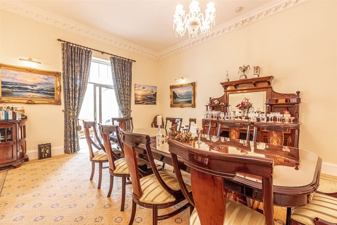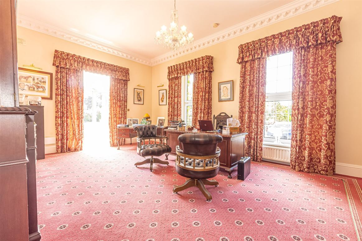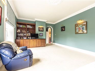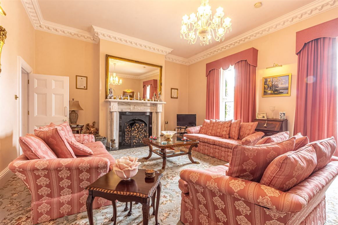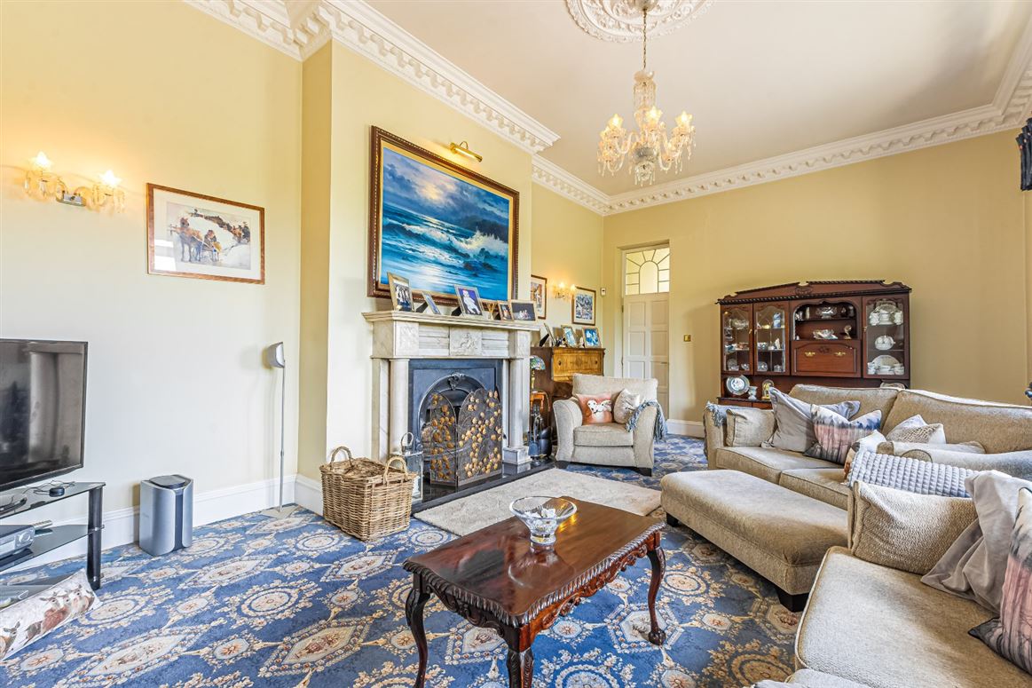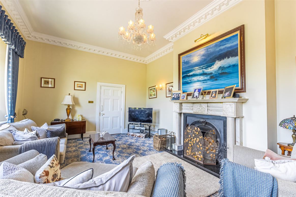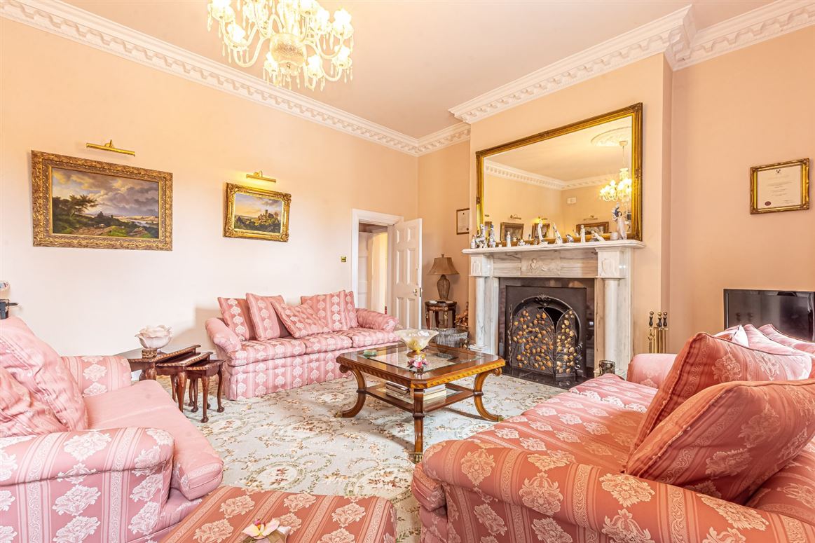 Carpet flooring. Black marble fireplace with polished granite plinth and cast-iron hearth. Decorative plaster coving and centre ceiling roses to ceiling. Tailor made curtains to windows with matching material pelmets, double doors to the gardens.