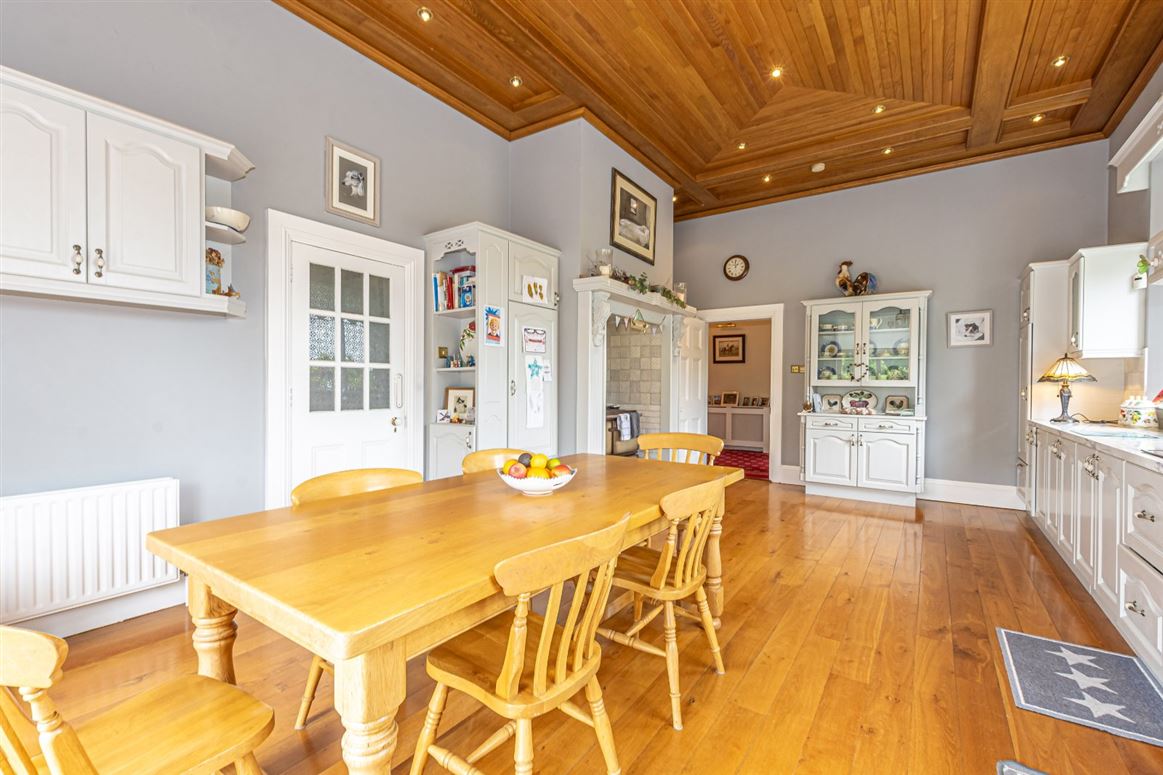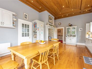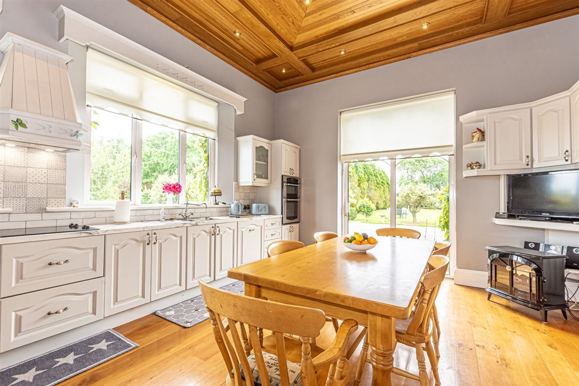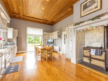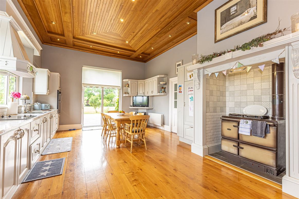 Solid oak wide plank wooden flooring. Highly detailed solid oak feature wood panelled ceiling with recessed lighting. Solid Oak fitted kitchen, hand made locally, with painted finish. Oil fired Stanley Stove, with head height over mantle and surround. Kitchen with integrated hob with cooker hood. Tiled splashback. Double ovens and fridge freezer. Wooden pelmet and blinds to window and patio doors.