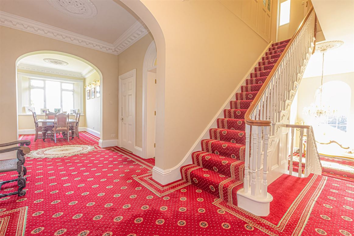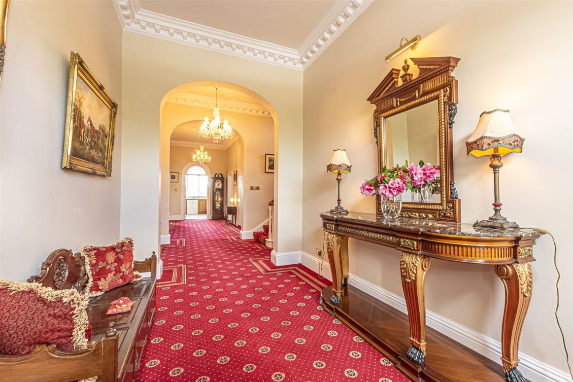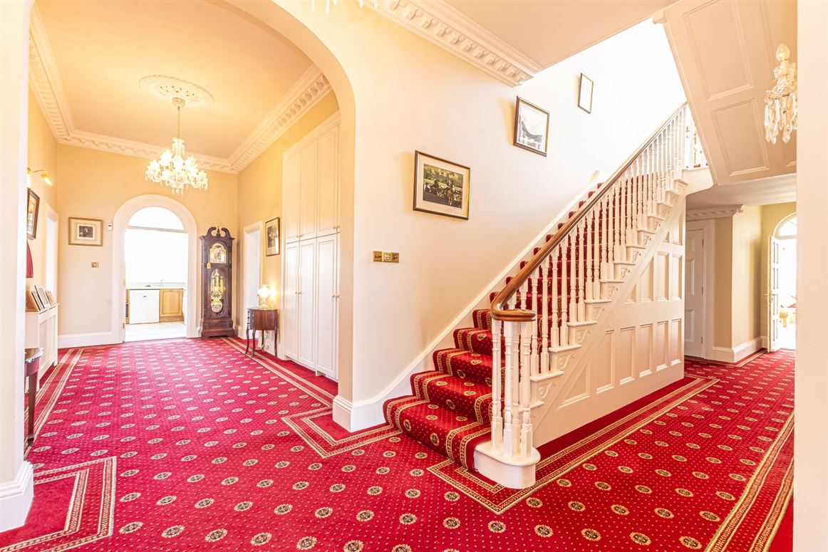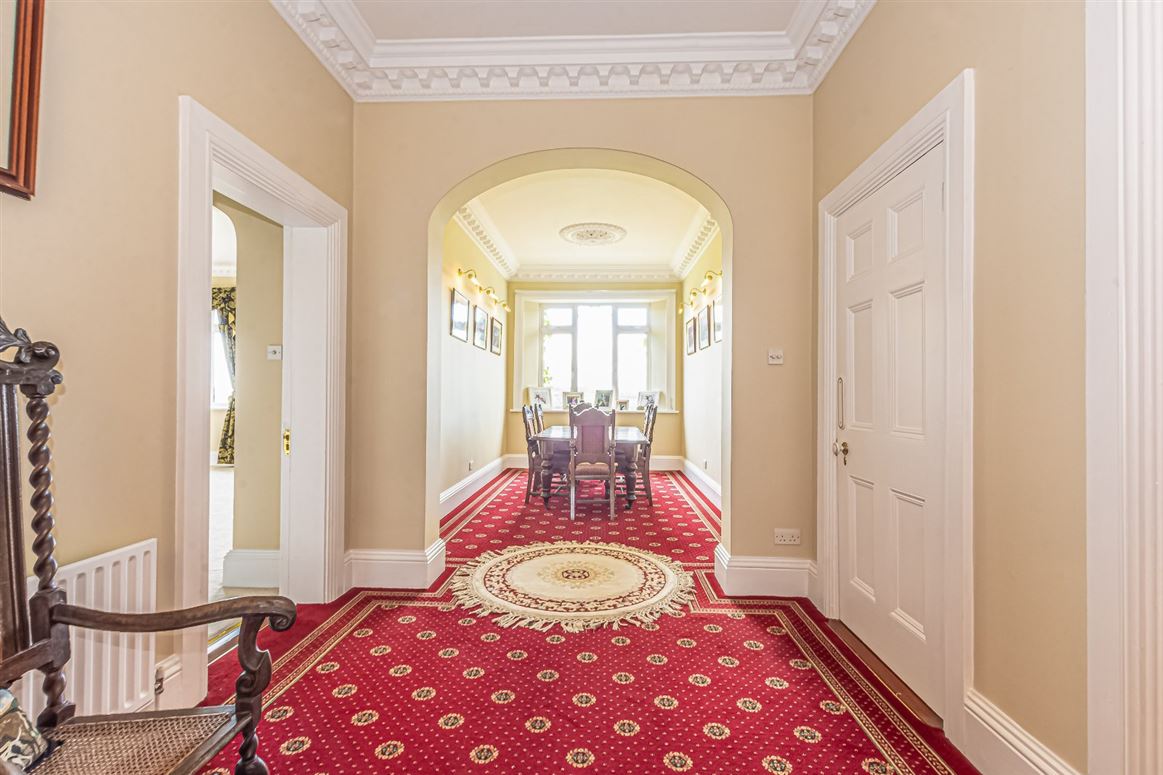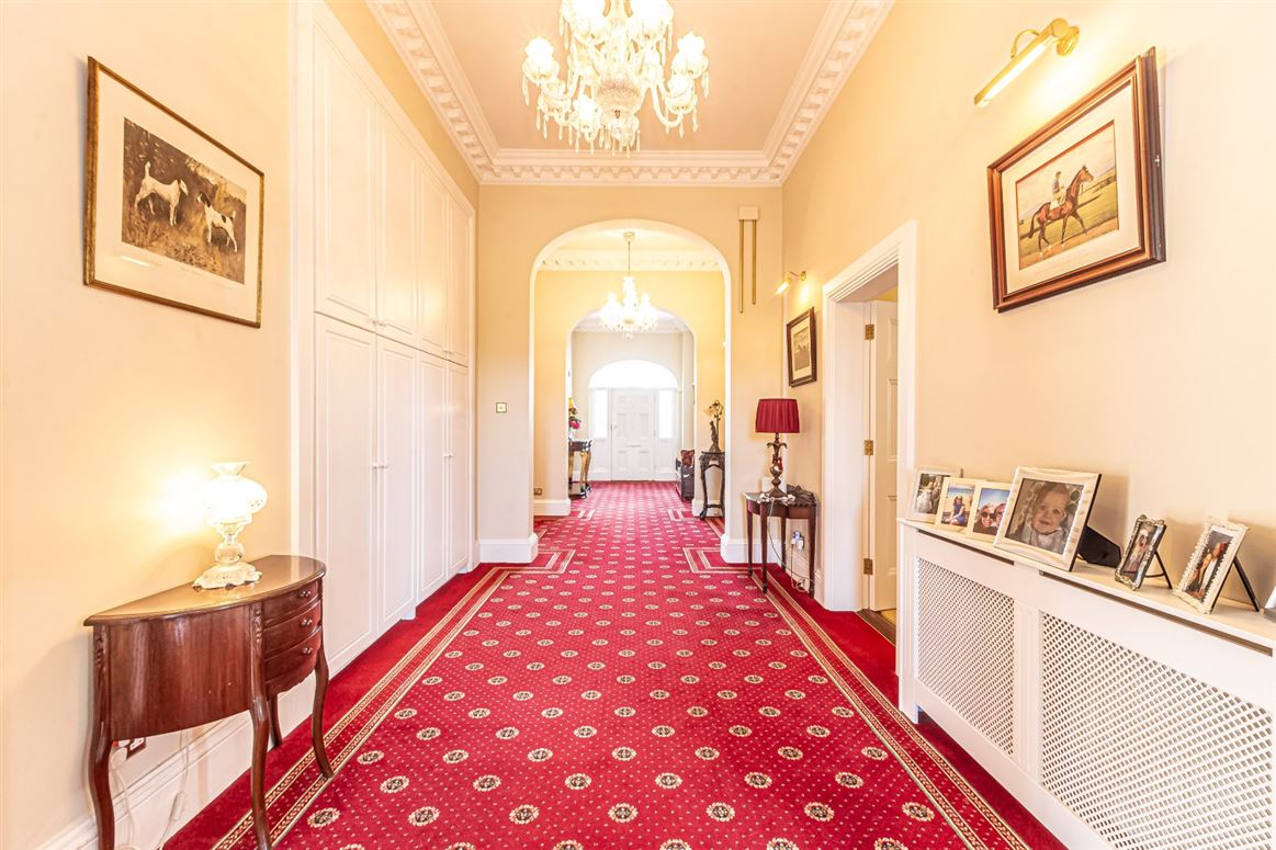 Tailor made carpet flooring with border detail throughout. Decorative plaster coving and centre ceiling roses to ceiling. Traditional wood panelled front door with overhead fan light. Wall picture lights throughout.