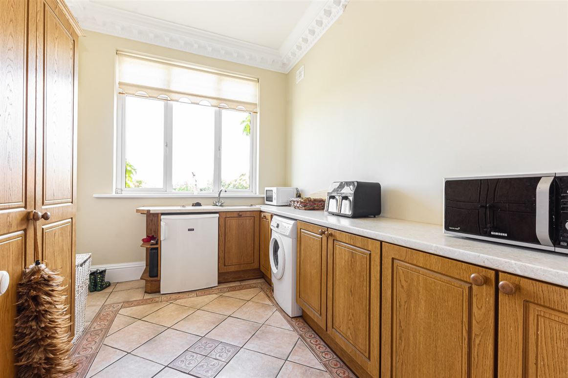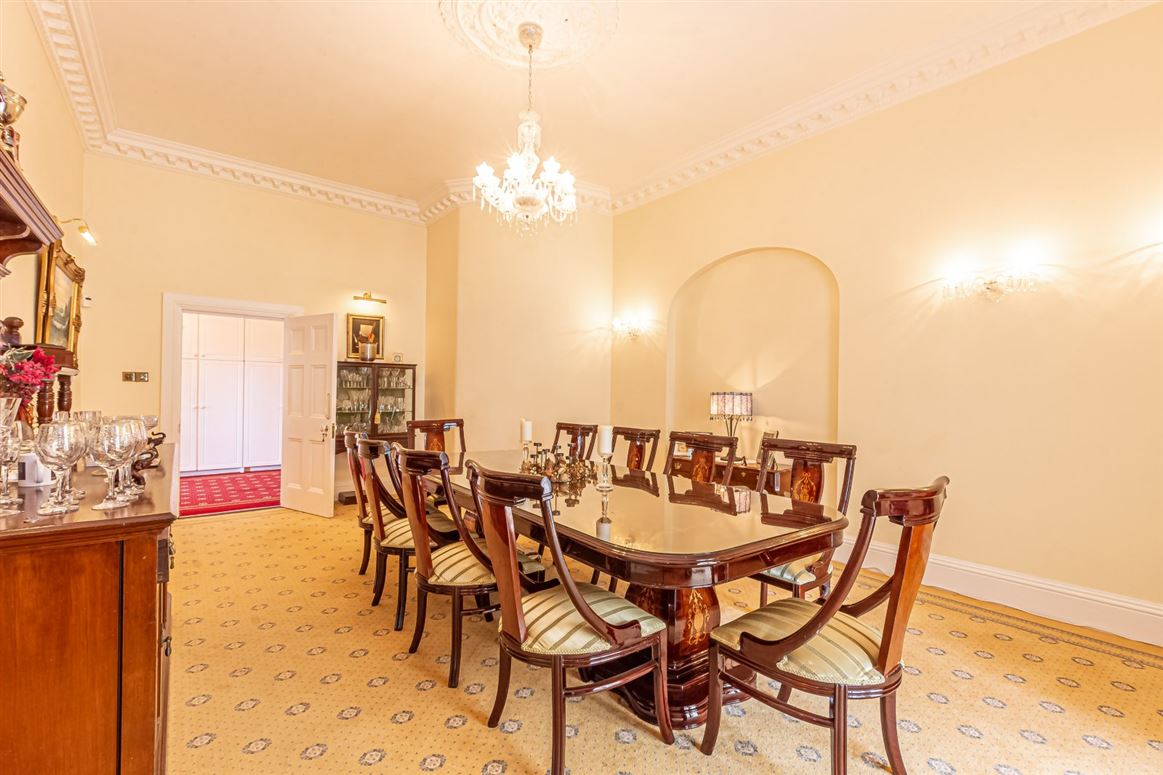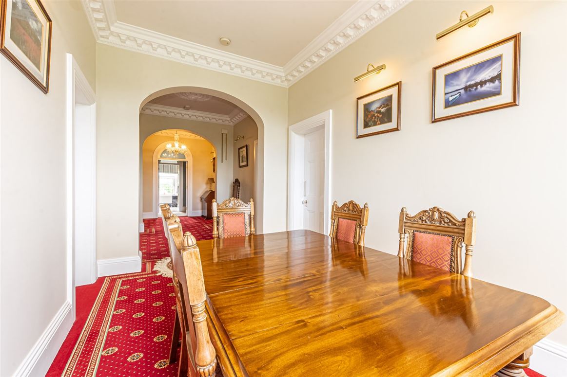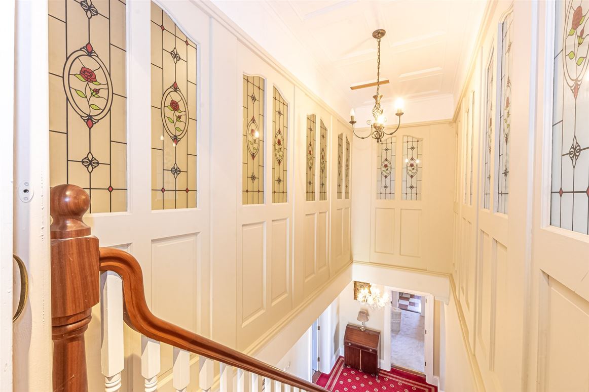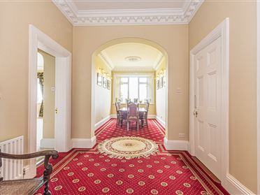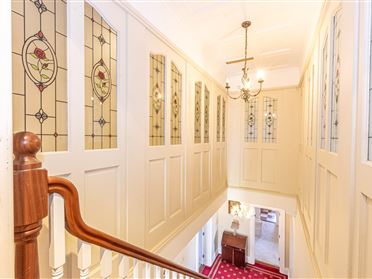Tailor made carpet flooring with border detail throughout. Decorative plaster coving and centre ceiling roses to ceiling. Traditional wood panelled front door with overhead fan light. Wall picture lights throughout.