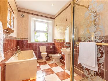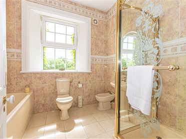 WC., WHB., Bath. Shower, Bidet. Floor and walls tiled from floor to ceiling. Decorative glass shower enclosure.