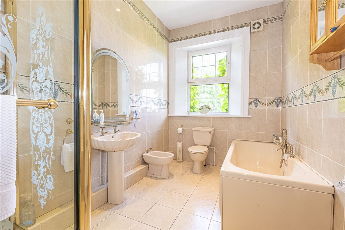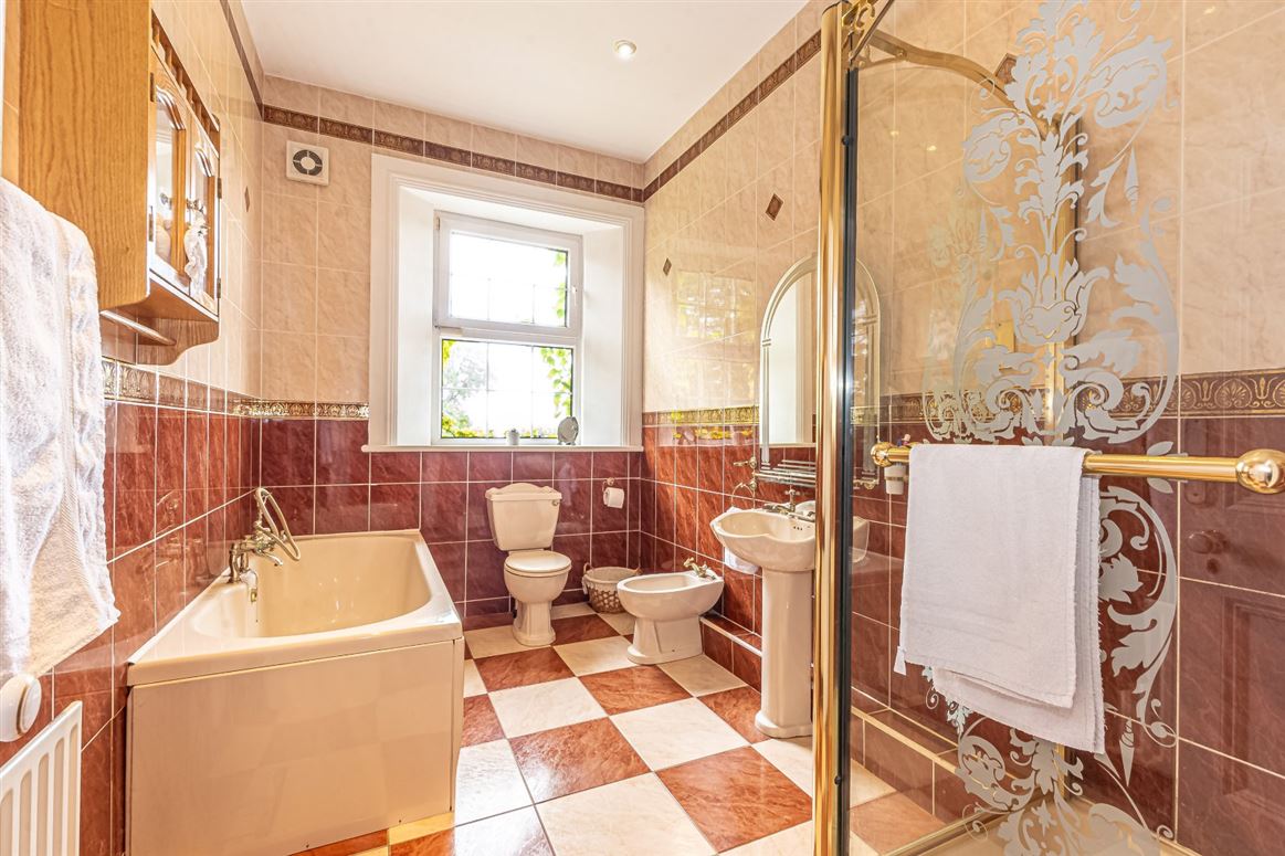 WC. WHB. Bath, Shower, Bidet. Walls tiled from floor to ceiling. Decorative glass shower enclosure. Roman blinds to window.