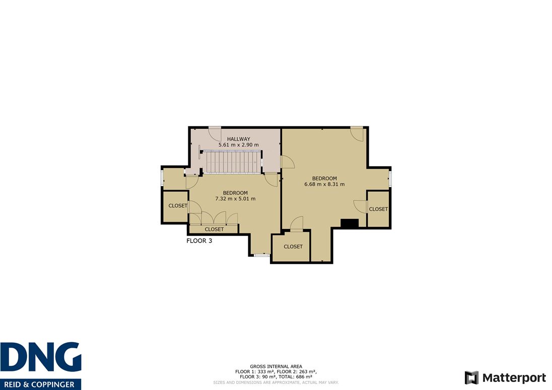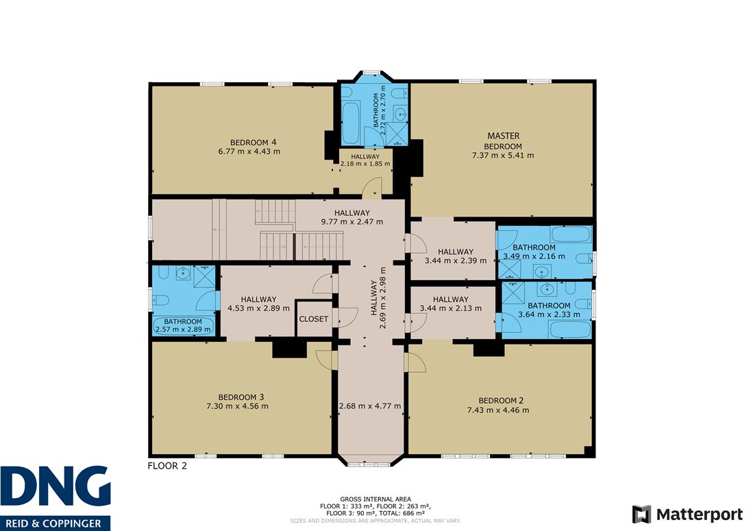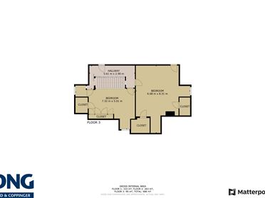 Generous bedroom suite with separate entrance hallway, and separate entrance. Extensive fitted wardrobes and vanity / dressing area. Carpet flooring throughout. Coving to ceiling with centre rose. Curtains to windows.