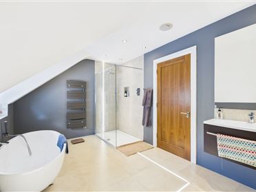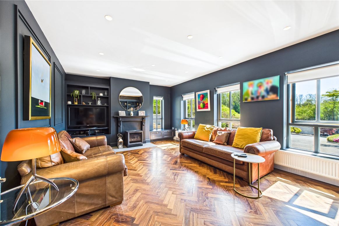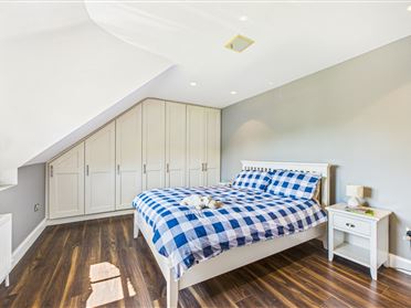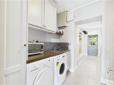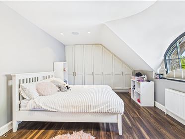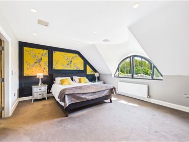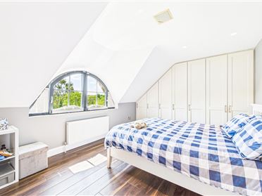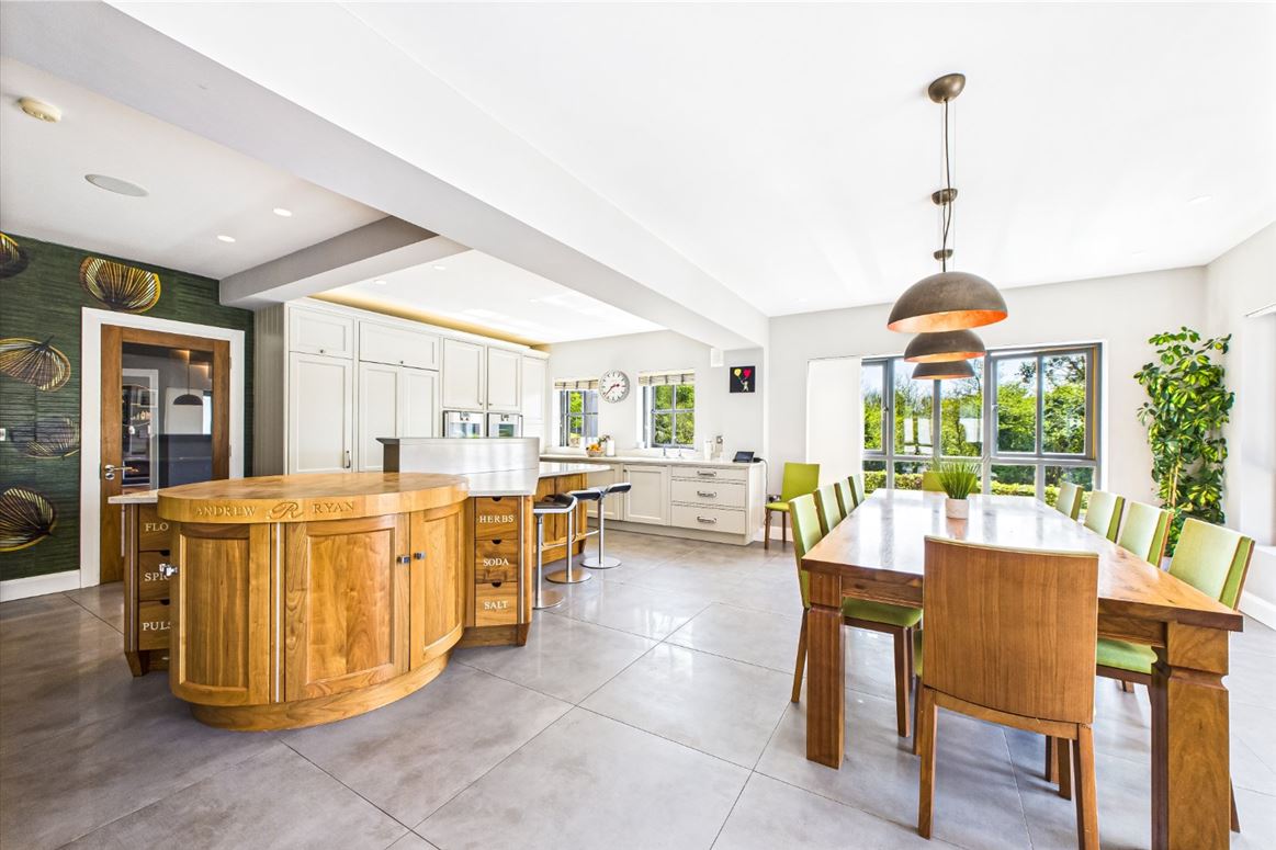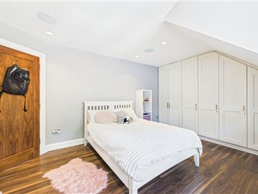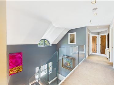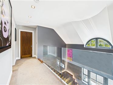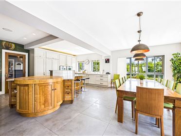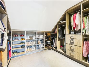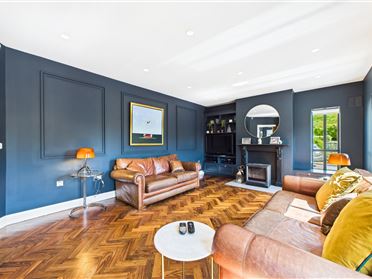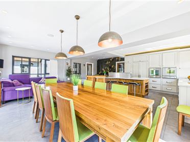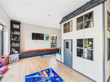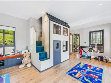 Inside, the house immediately impresses with the warm and welcoming ambiance and colour scheme of the double height entrance hall, with a modern floating walnut finished stairs and glass balustrade. The interior decor has been tastefully curated to blend traditional materials such as quality tiled floors and herringbone parquet wooden floors, together with high-spec modern finishes offering a luxurious feel throughout. The jewel in the crown is the centre piece of the kitchen area, with a bespoke handmade 'Andrew Ryan' in-frame fitted kitchen complimented by an impressive inventory of Gaggeneau appliances, suitable for any Michelin Star Chef. The kitchen area also offers a total living experience, combining a dining area with elegant overhead lighting, together with family lounge area. A large playroom with feature children's indoor playhouse is also situated just off the kitchen and would be ideal for conversion to an additional reception room or siimilar when no longer required.