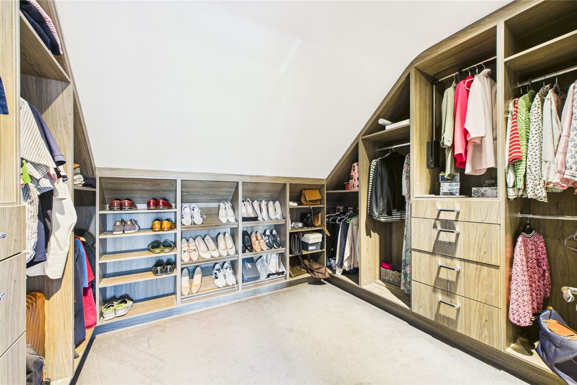 Sizable walk-in wardrobe and dressing area. Extensive wallnut finish fitted units with shoe racks, hanging space and drawer units. Carpet flooring.