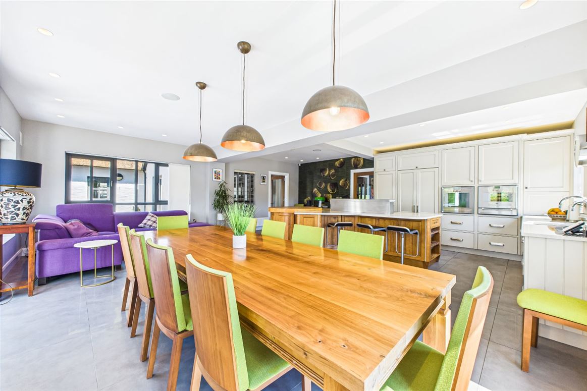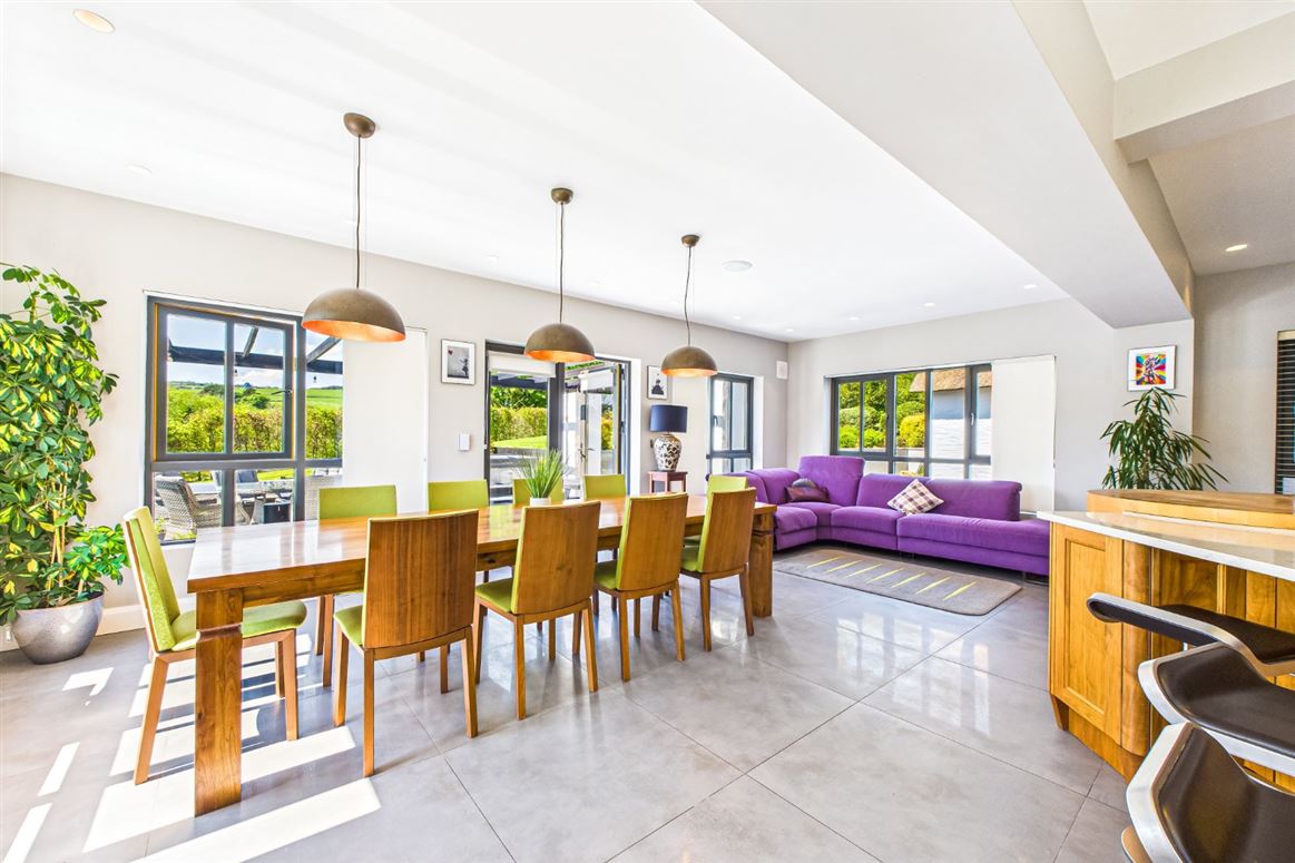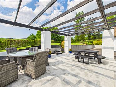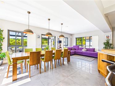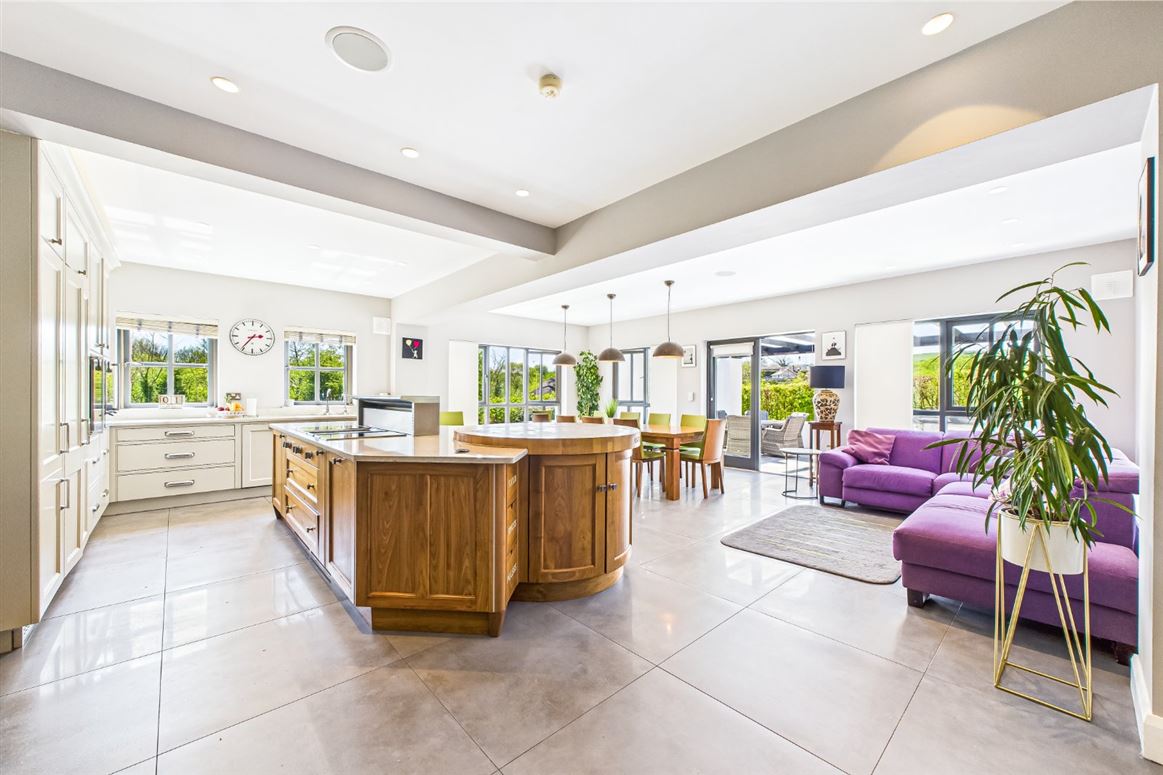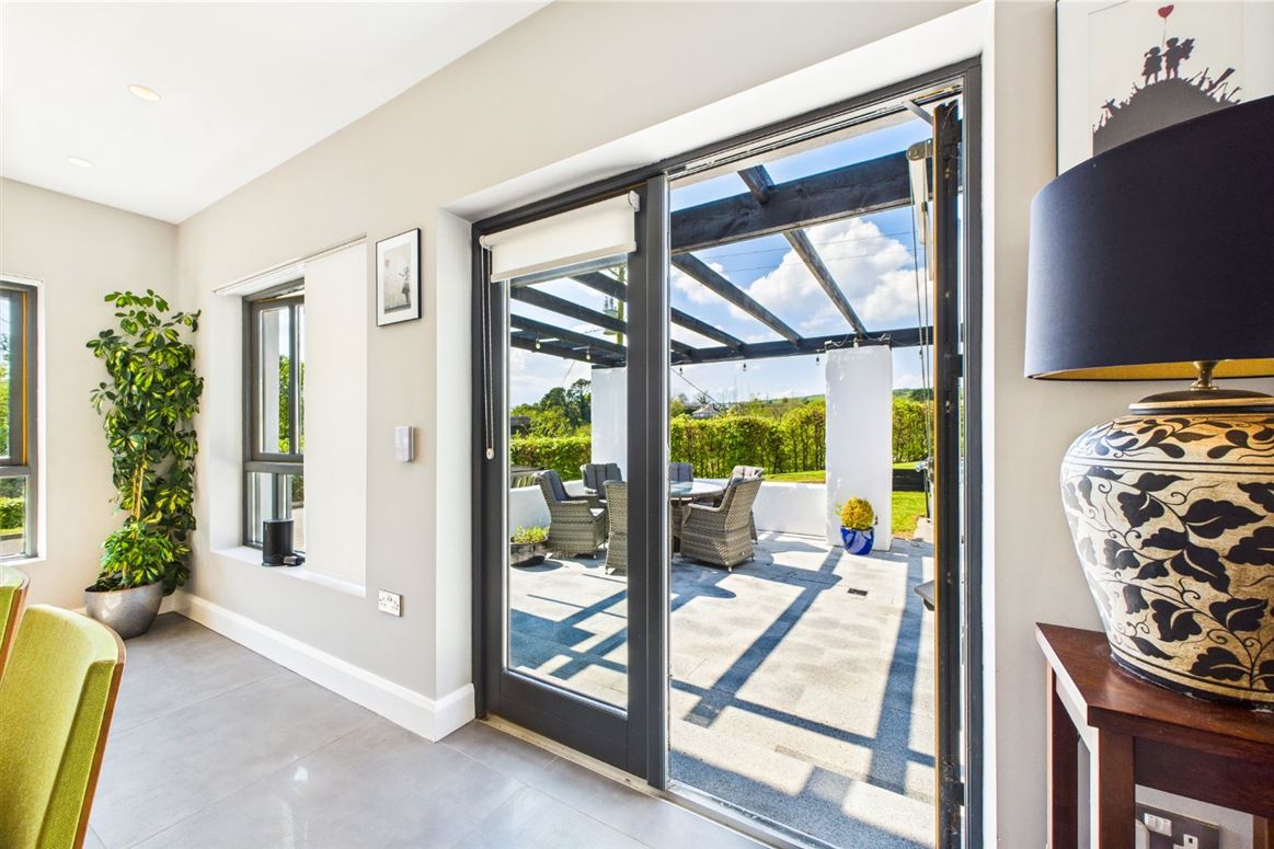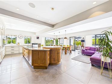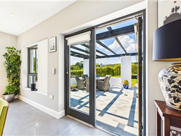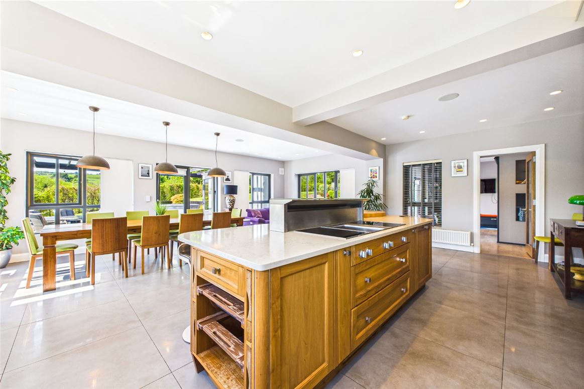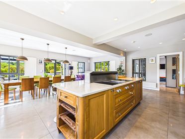 Expansive open plan kitchen. dining and living area, beautifully finished with large square porcelain tiled flooing. Handmade Bespoke 'Andrew Ryan' in-frame fitted kitchen with an impressive inventory of Gaggenau appliances, including induction hob, Tappenyaki grill, combi convection oven and combi steam oven with hob plate. Two Quooker taps. Centre island breakfast bar. Quartz counter top. Recess lighting. French doors from dining / living area to extensive patio area, featuring a Pergola with hobtub.