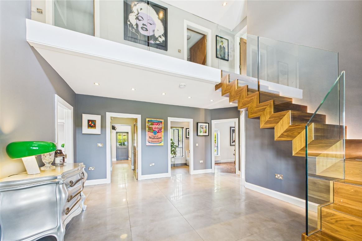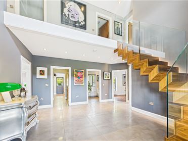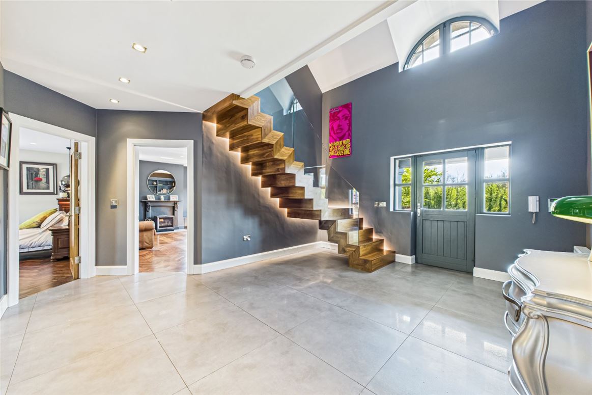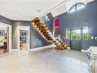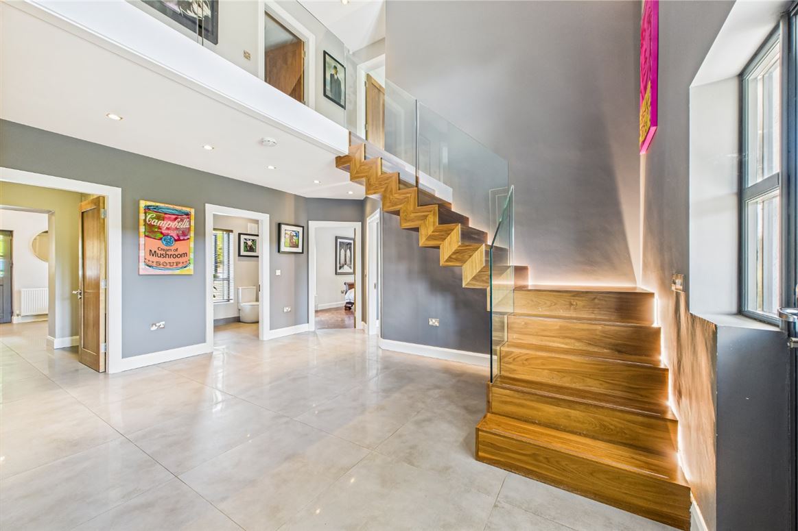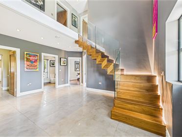 Impressive entrance hall with vaulted ceiling and open landing. Polished porcelain tiled flooring throughout. Feature floating stairs in wallnut, with glass handrail and LED strip lighting.