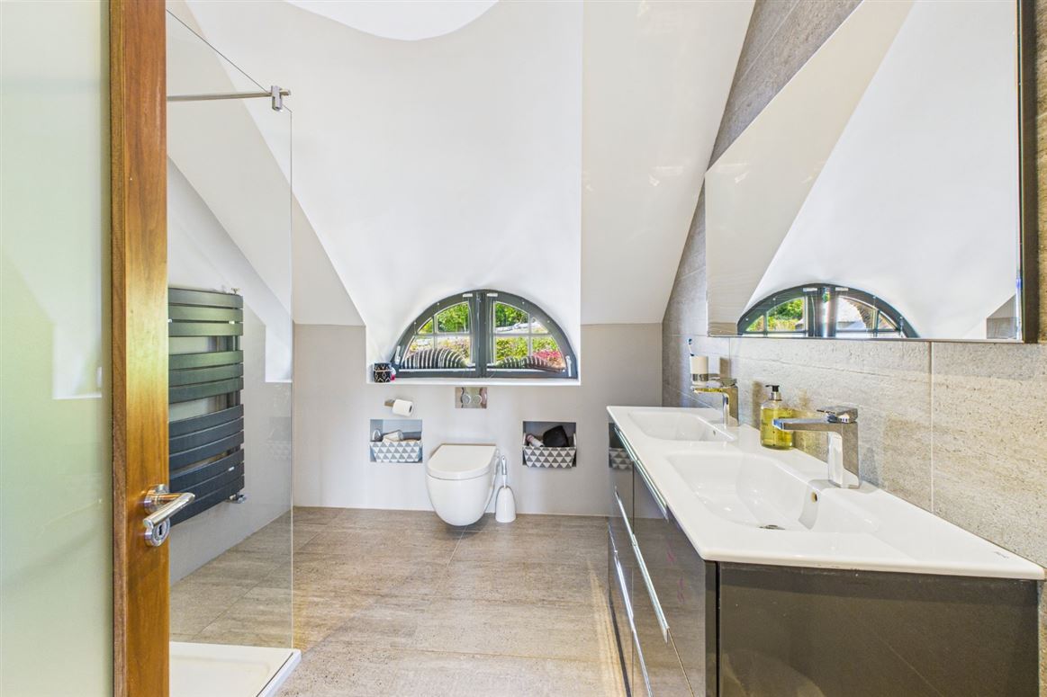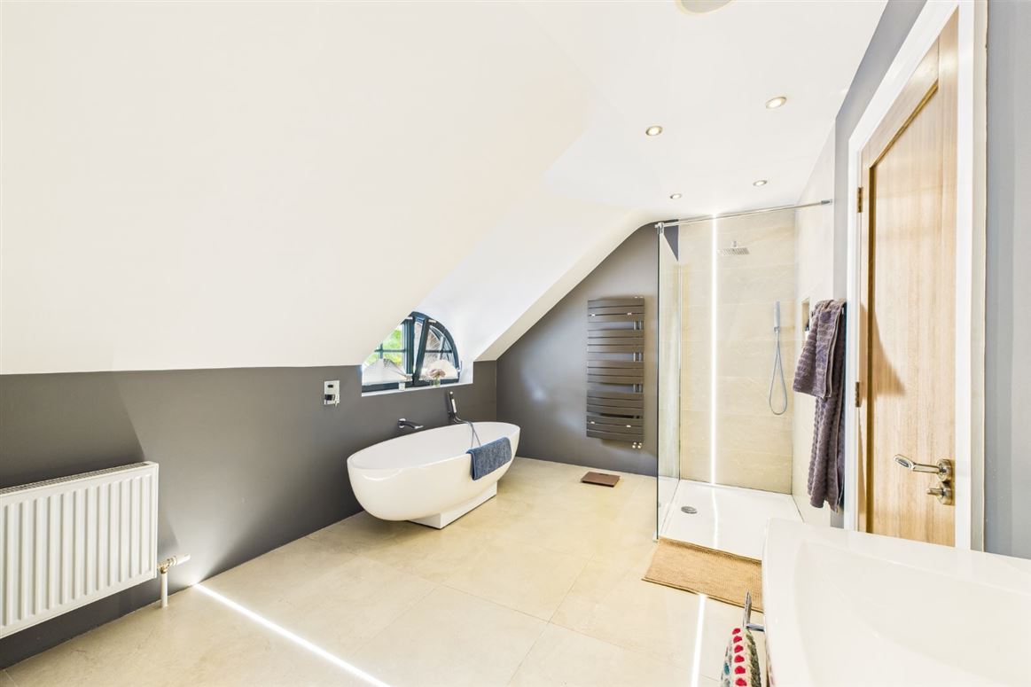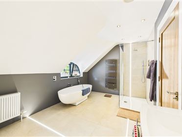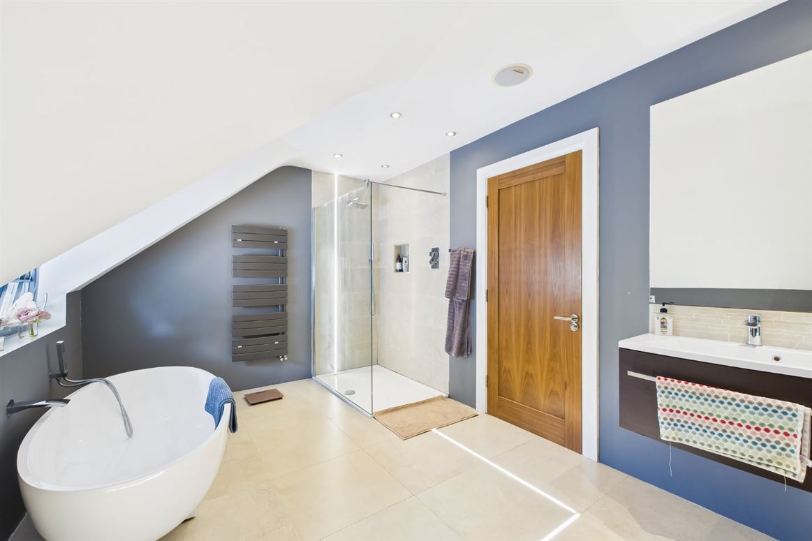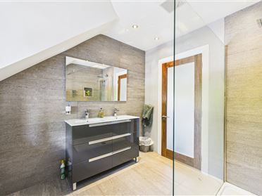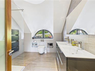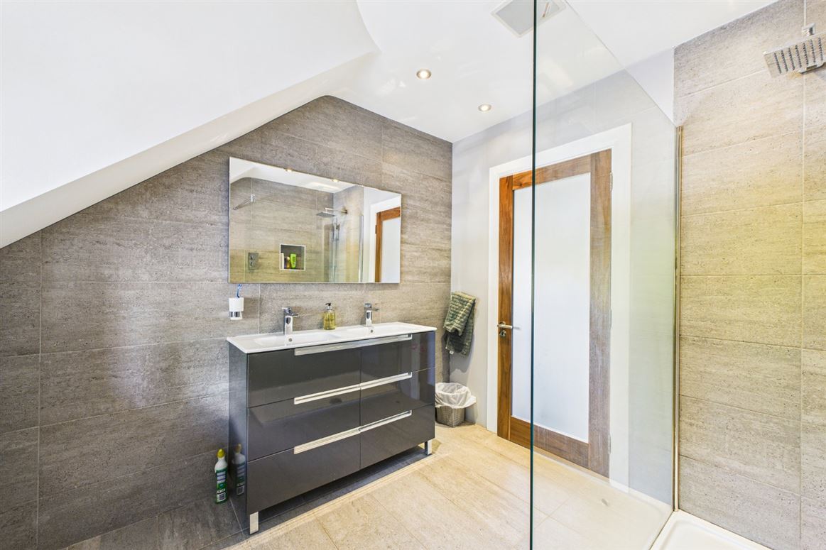 Beautifully tiled floor and walls in an archictural grey finish. Cantelevered WC, Fitted dual sink vanity unit, shower with glazed enclosure and rainwater shower, verticle heated towel raill radiator. half moon feature window.