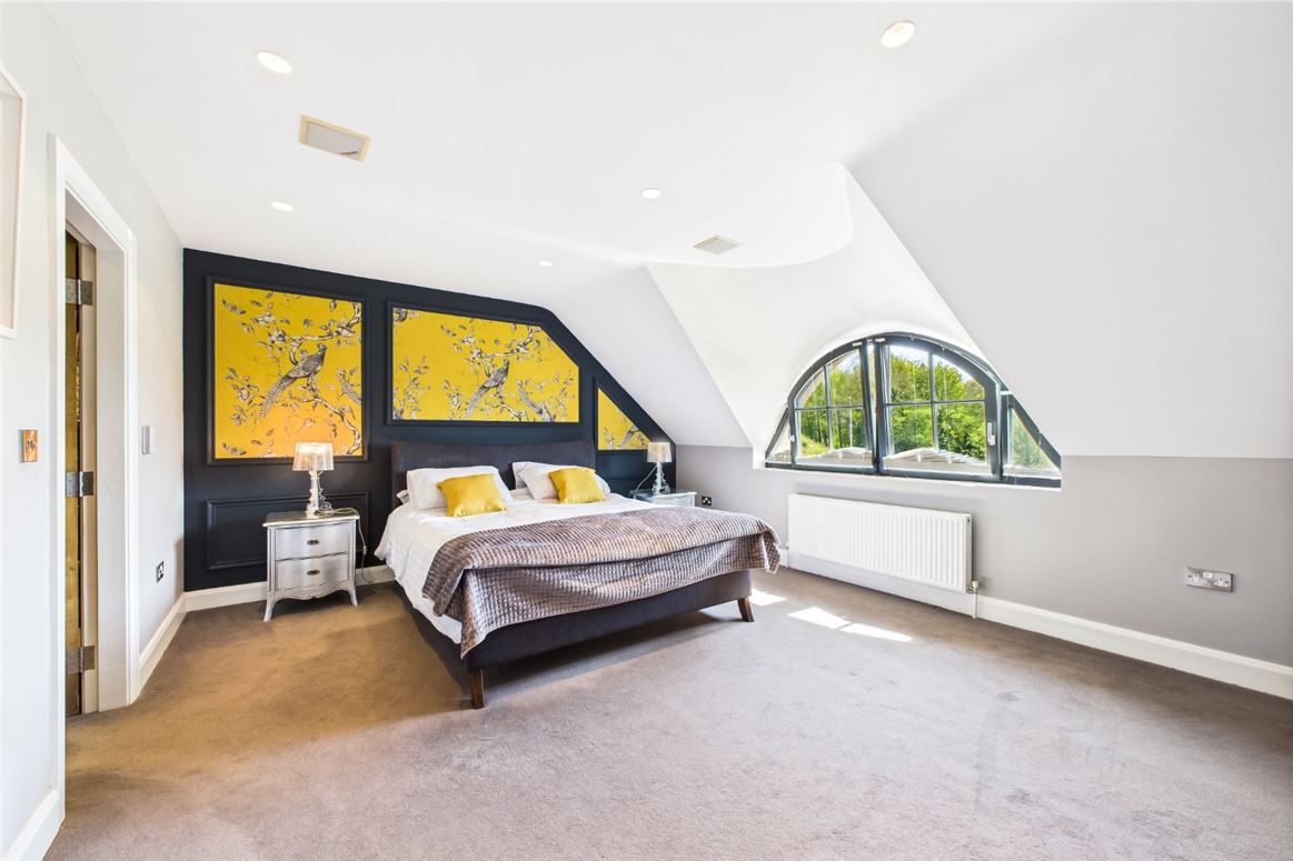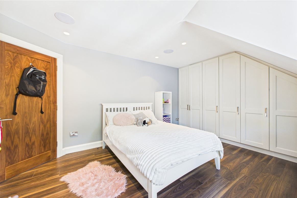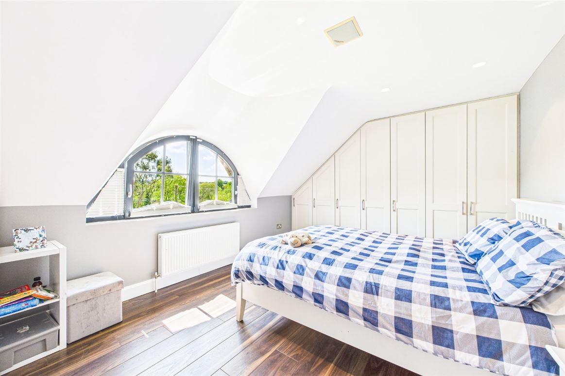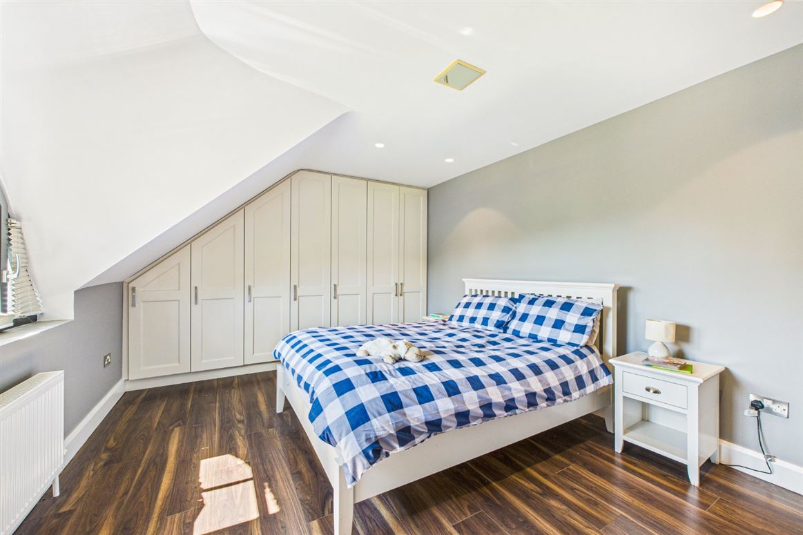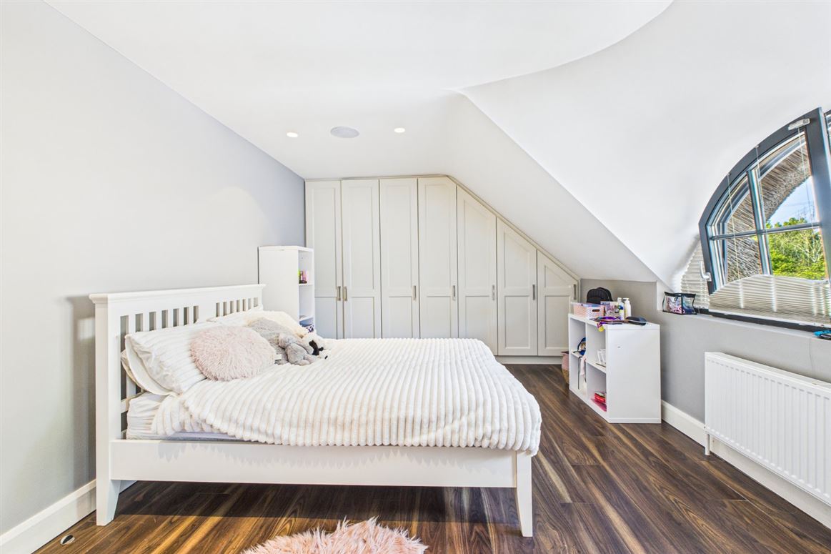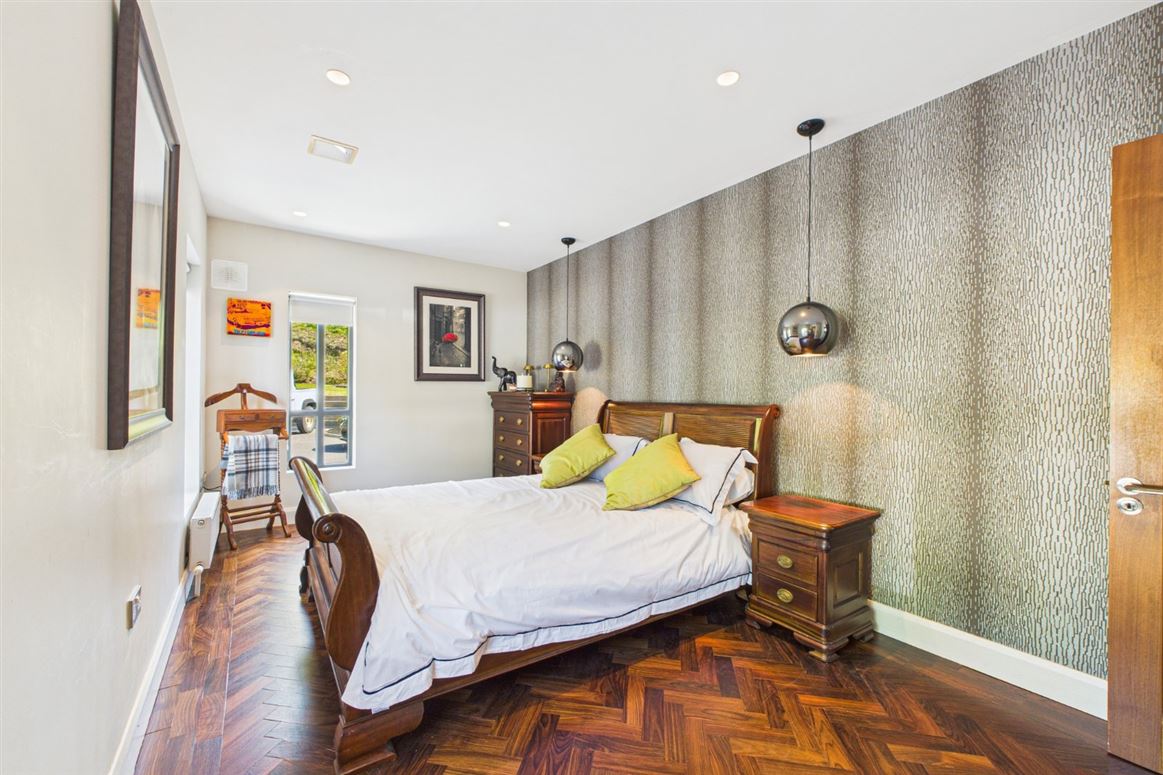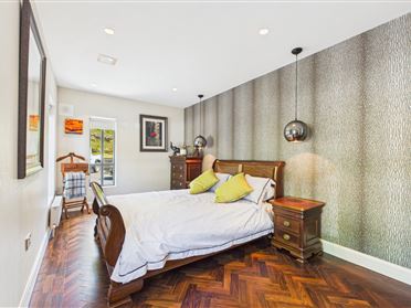 Ground floor guest bedroom with en-suite shower room, ideal for guests or multi generational living. Feature Herringbone parquet flooring, Wall papered feature wall. Recess lighting. Blinds to window.