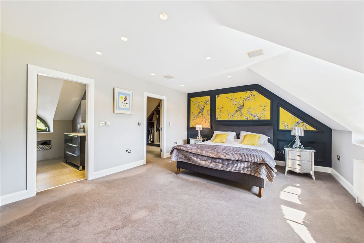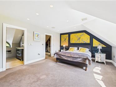 Impressive master bedroom suite, with en-suite and walk-in wardrobe. Carpet flooring, feature panelled wall in contrasting deep blue colour. Feature half-moon window, and recessed spot lighting to ceiling.