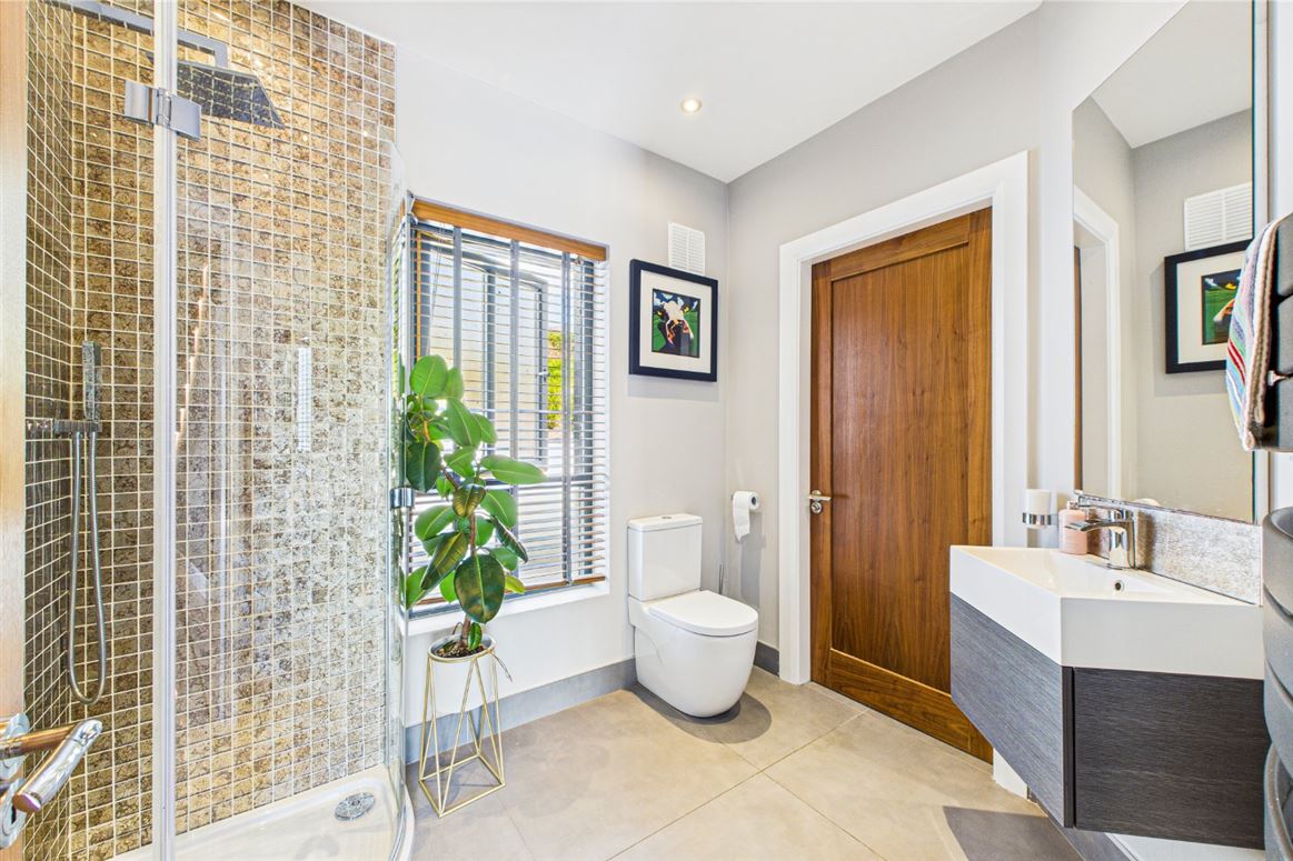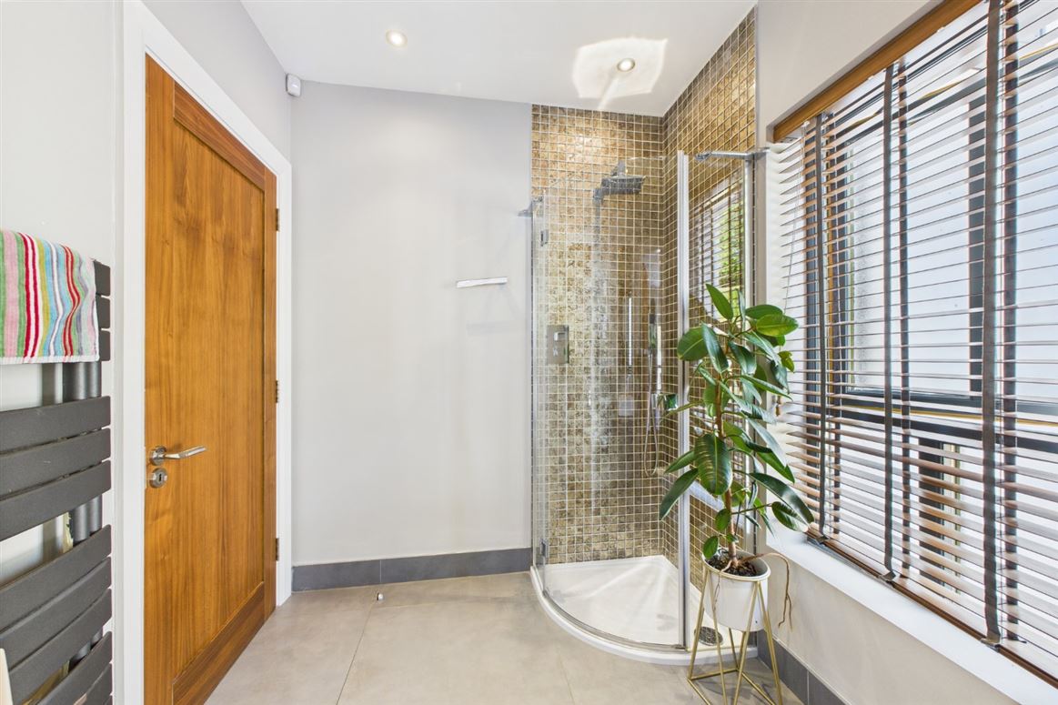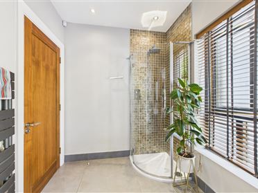 En-suite shower room with WC, WHB and Shower. Tiled floor with tiled skirtings. Quadrant shower with mosaic tiled walls, glazed shower enclosure and rain-water shower unit. Cantilevered wash hand basin with vanity unit. Blinds to window. Dual use shower room with additional access from hallway.