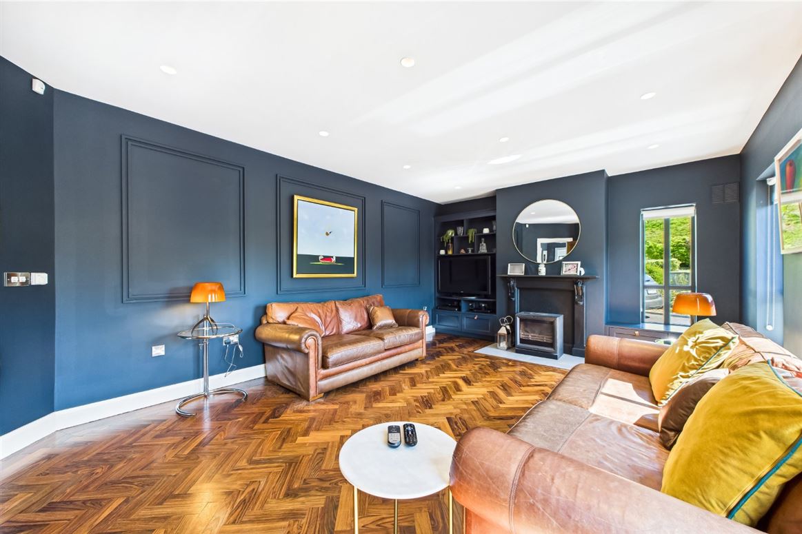 Herringbone parquet flooring. Walls painted in a rich blue with picture frame detail on walls. Fitted TV unit with drawers and shelving. Wood burning stove to fireplace. Recessed lighting. Blinds to window.