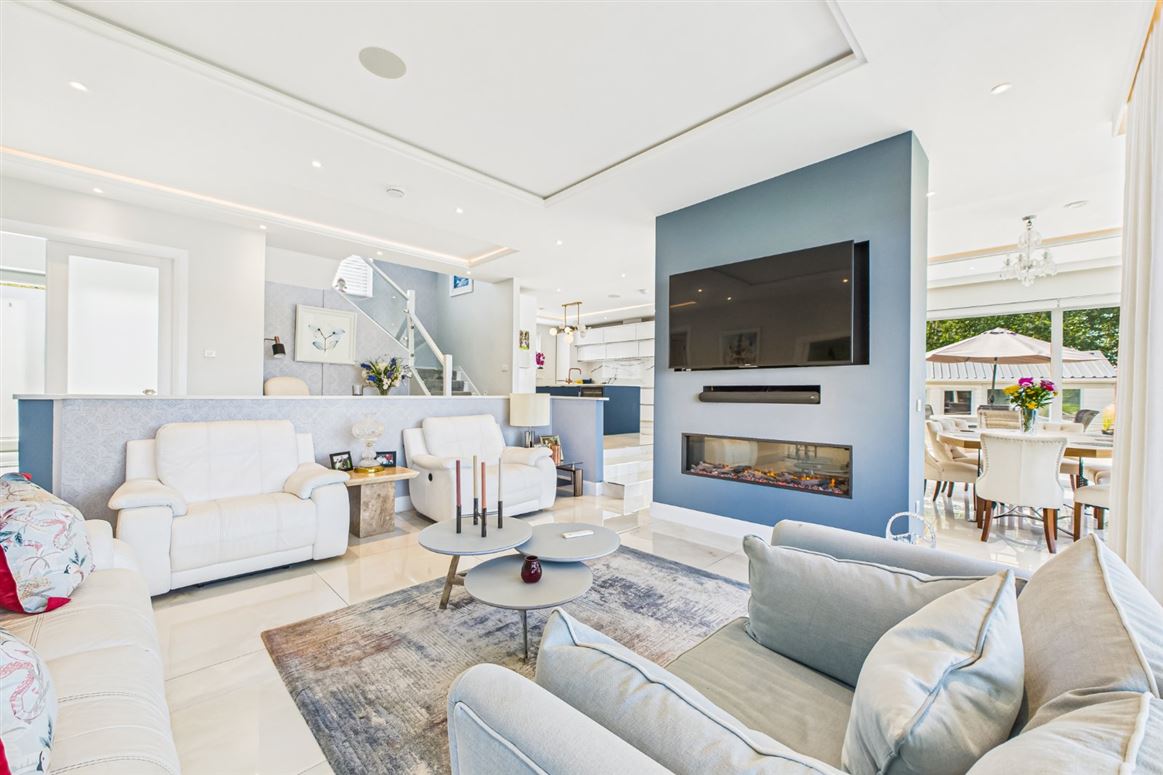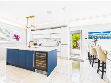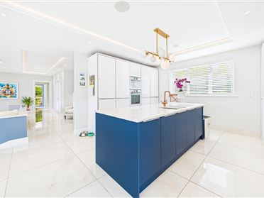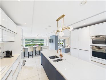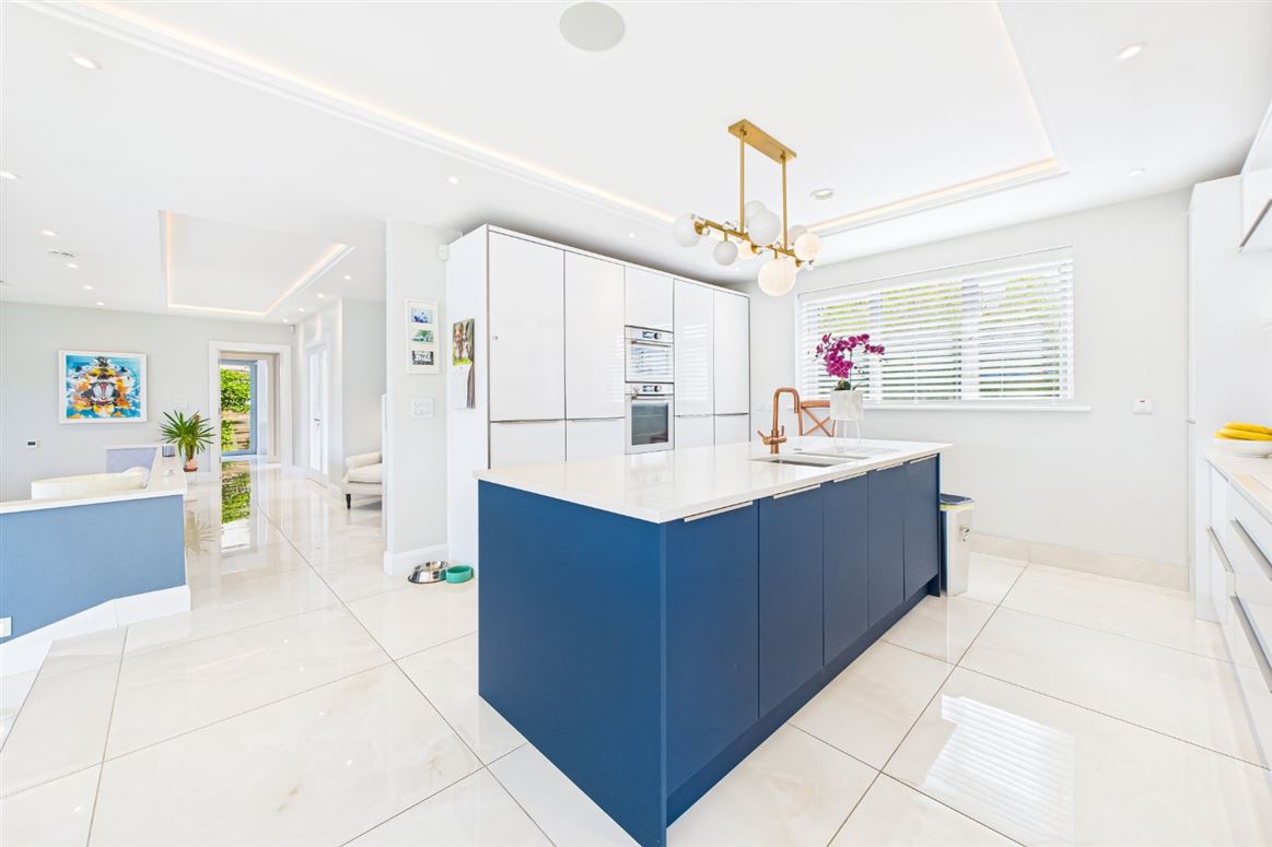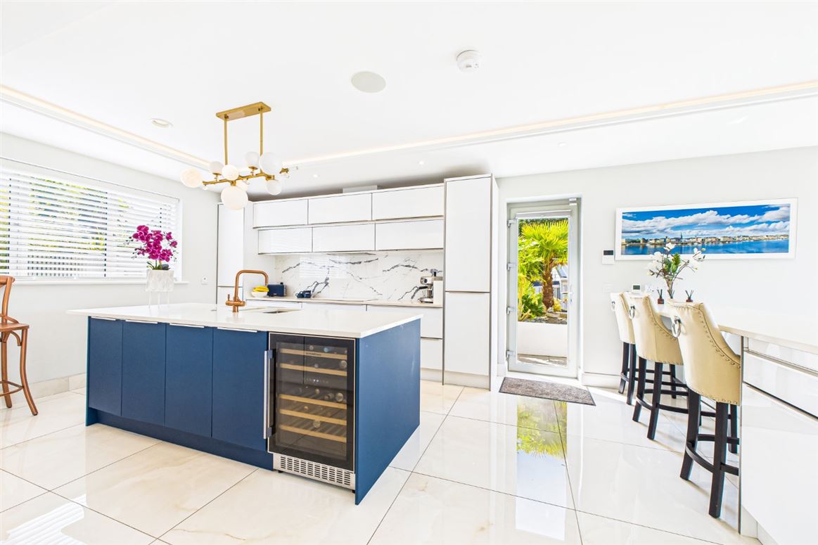 Bespoke kitchen with white high gloss units and Silestone quartz worktops. Large island finished in teal with double sinks. Iintegrated De Dietrich appliances with marble splashback. Elevated breakfast bar with superb river views. Glazed door to side.