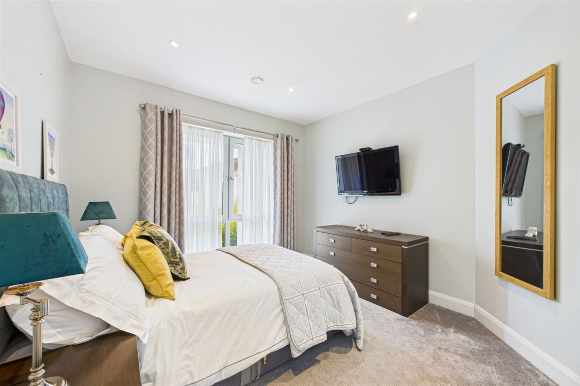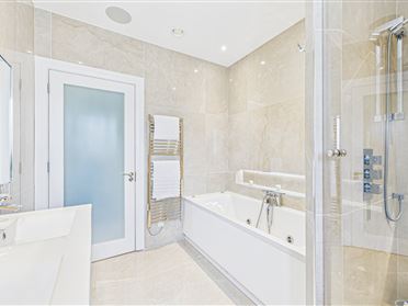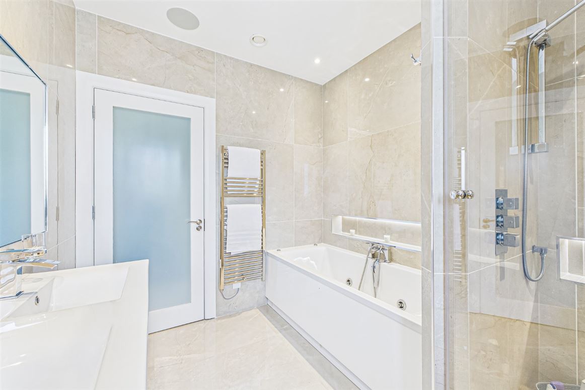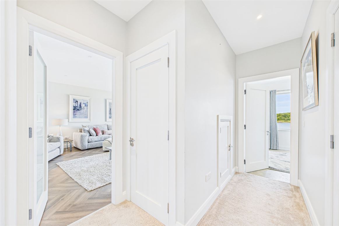 The entire left of the first floor is occupied by the sumptuous master suite. The generous master bedroom has a lovely picture window, framing the beautiful river views. There is a bank of slide robes, as well as a fitted dressing room with bespoke built in walnut storage and a luxurious ensuite bathroom with marble tiling, a whirlpool bath and double rain shower.