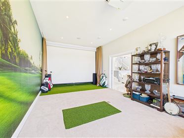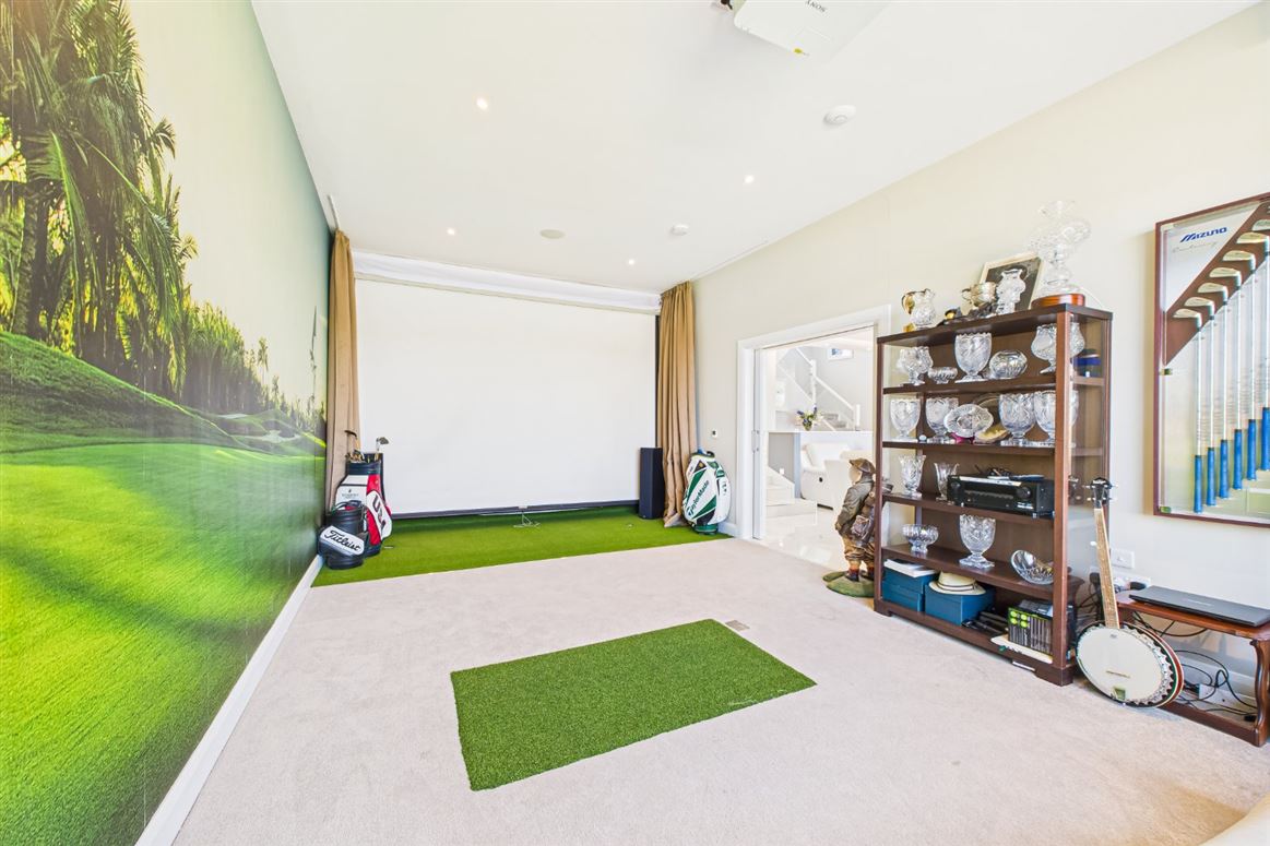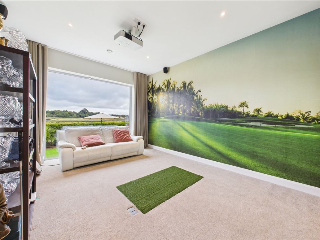 Off the living area is a golf studio / Cinema with floor to ceiling glazing is accessed via neat pocket doors and comes with a golf simulator and 4k cinema projector complete with surround sound.