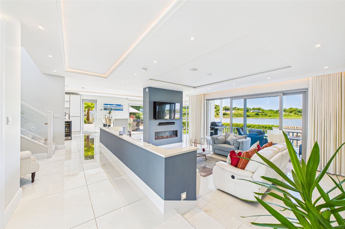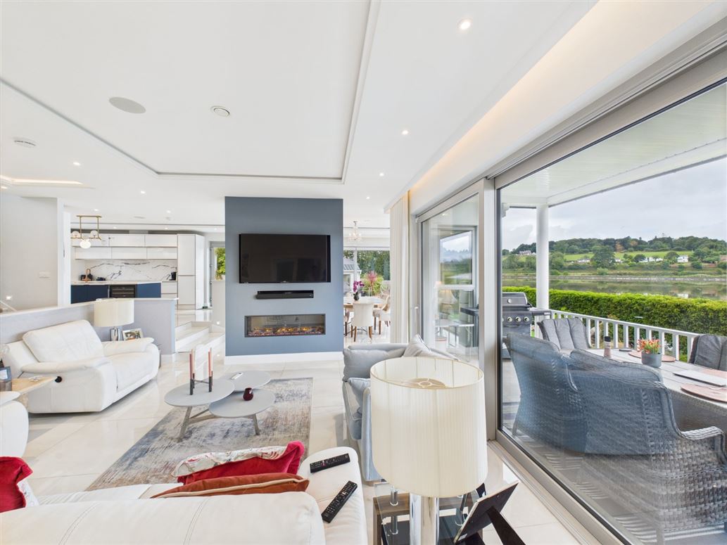 Tiled entrance porch with double opaque glazed doors opening onto the dual aspect open plan split level living / dining area. Living area with dropped ceiling and ambient lighting with wall mounted electric fire insert, oversized sliding doors open onto a deep raised limestone patio with panoramic river views and a wall mounted electric heater. The large dining area has a dropped ceiling, ambient lighting and oversized sliding doors which leads onto a large porcelain tiled patio.