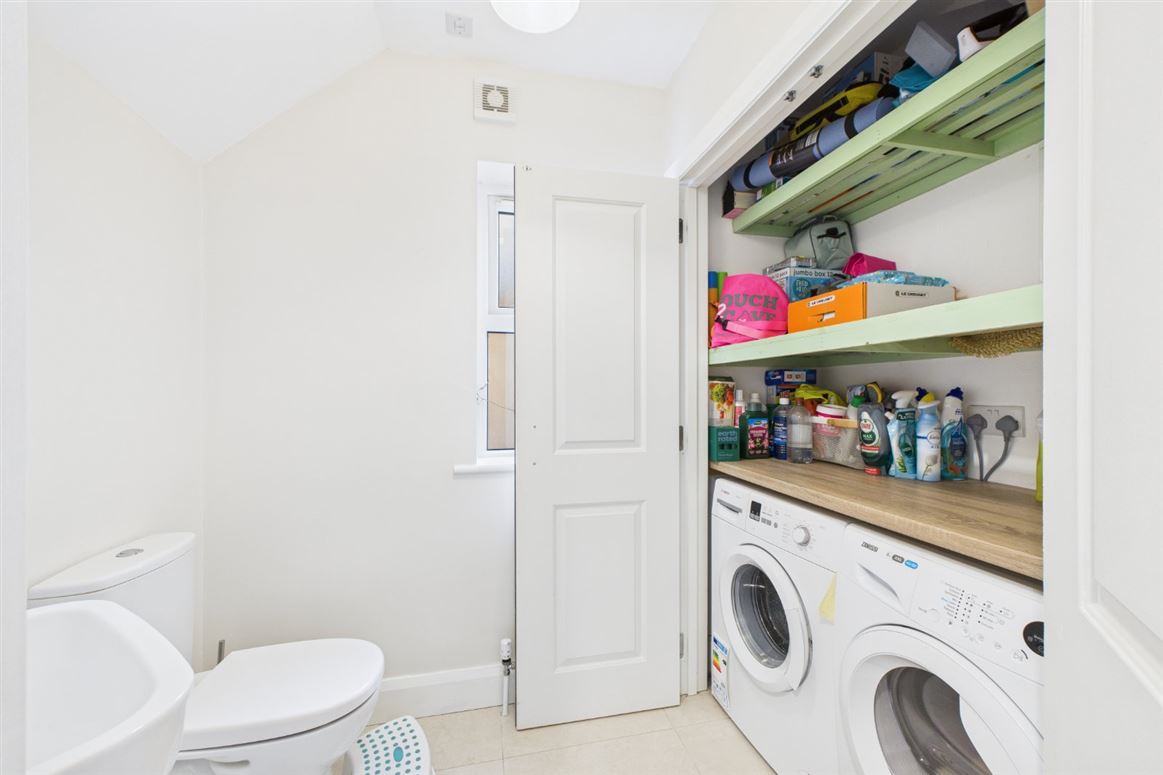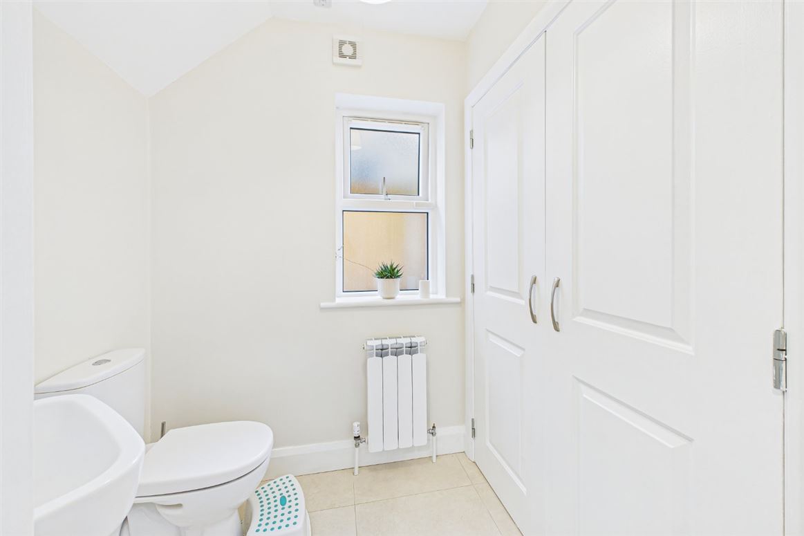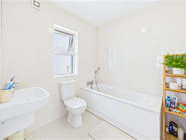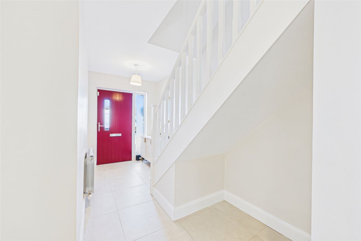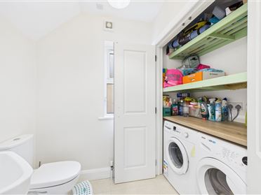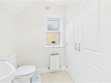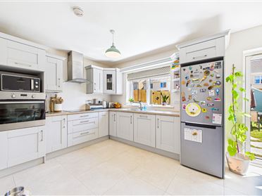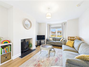 The entrance hall comprises a newly tiled cream porcelain floor following through to the kitchen and dining area. A sizable downstairs WC also functions as a utility room with a cleverly concealed laundry area hidden behind a set of double doors. An elegant shaker style fitted kitchen is the centre piece of the kitchen dining area, which also has French doors to the rear garden area, and concealed sliding door to the living room. The living room is situated to the front of the house and has engineered wooden flooring and a solid fuel stove to the fireplace. A white painted stairs with centre carpet runner leads to the spacious landing which is central to the three generously proportioned bedrooms and main bathroom. The large master bedroom has the benefit of sliderobe wardrobes, and has a newly updated en-suite shower room, completed to a very high standard with floor to ceiling tiling and shower with rainwater shower head and glass enclosure. The main bathroom is also fully tiled with WC, Whb and bath complete with shower mixer.