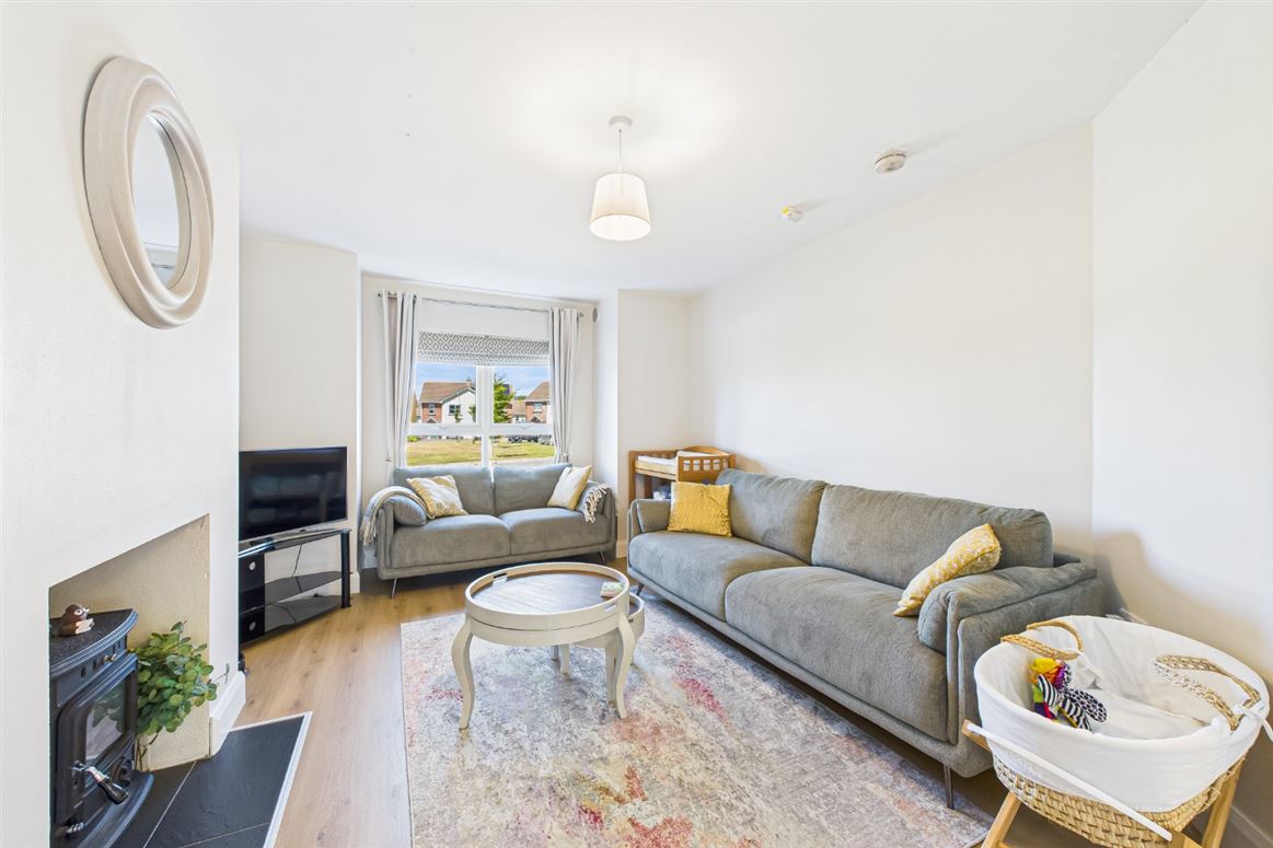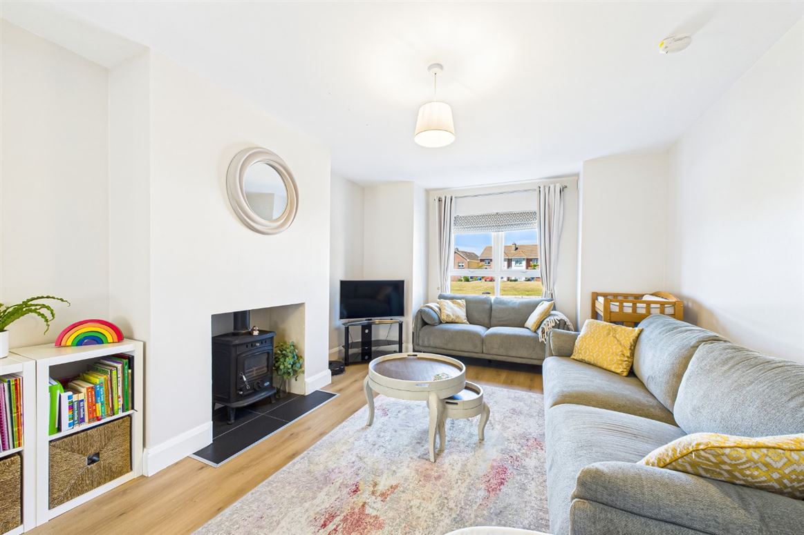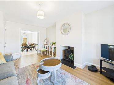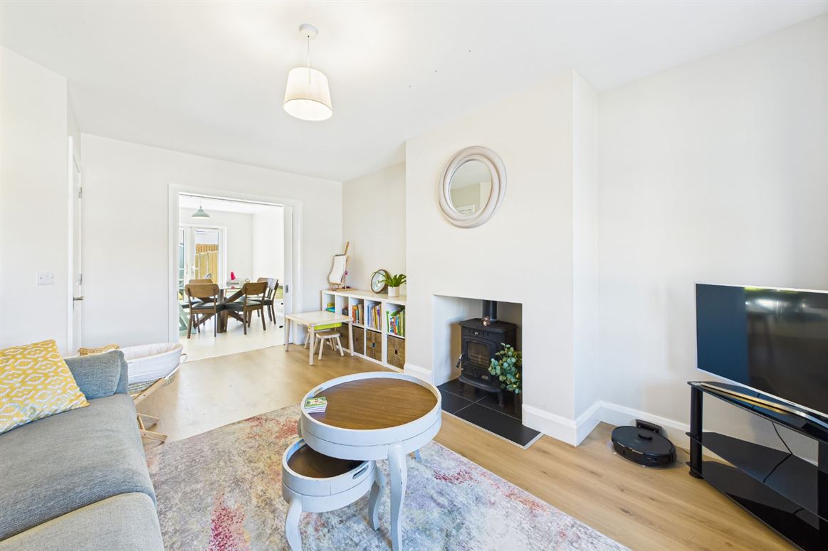 Engineered wooden flooring. Solid fuel stove to fireplace. Curtains and roman blinds to bay window. Sliding double doors to kitchen/diner.