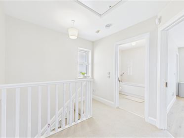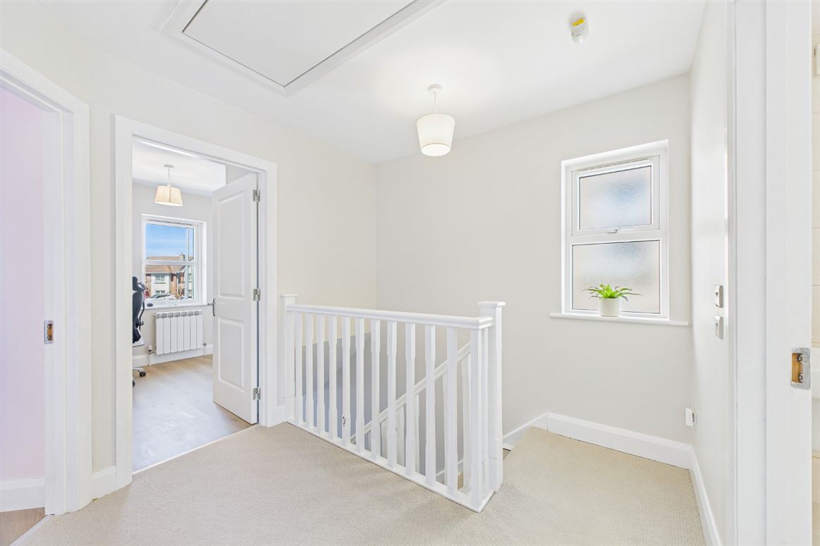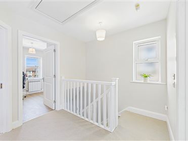 White painted stairs with centre carpet runner. Large open landing in carpet. Stairs and Attic Stairs. Roof space floored and suitable for attic conversion.