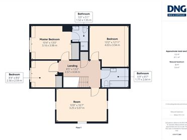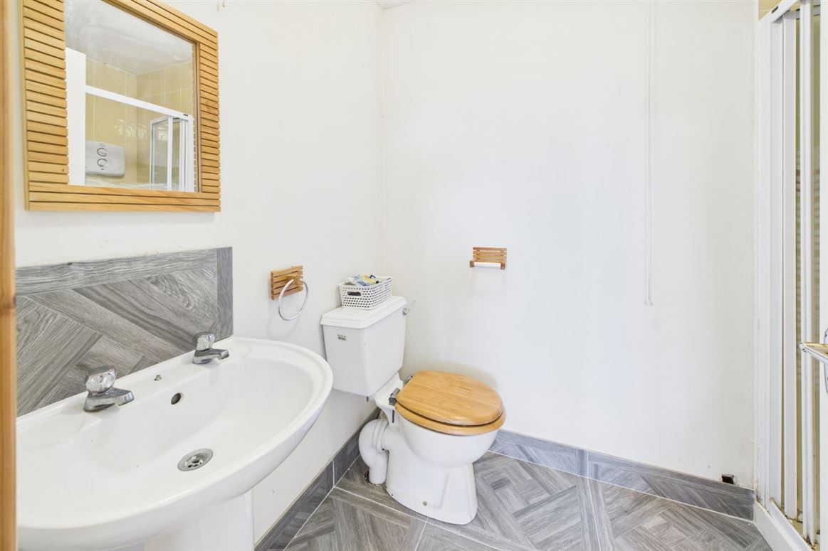Tiled florong and part tiled walls. WC, WHB and Bath. Roller blind to window.