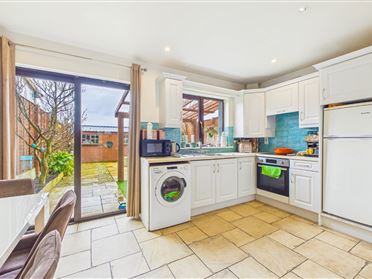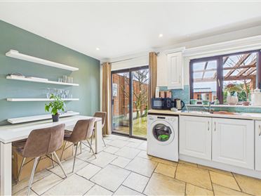 Slate tiled flooring. Fitted kitchen with integrated oven and hob. Sliding doors to rear garden. Recess lighting. Curtains to window.